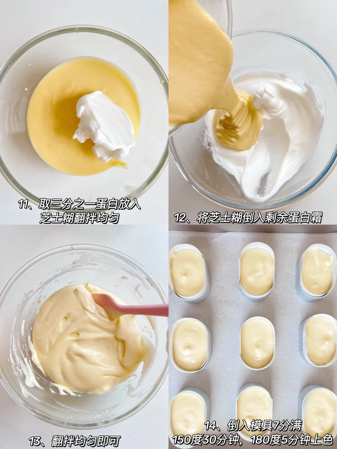 4、倒入模具七分满(水浴法 :烤盘装入2厘米高的水)烤箱预热后150度半小时转上色可再烤180度5分钟