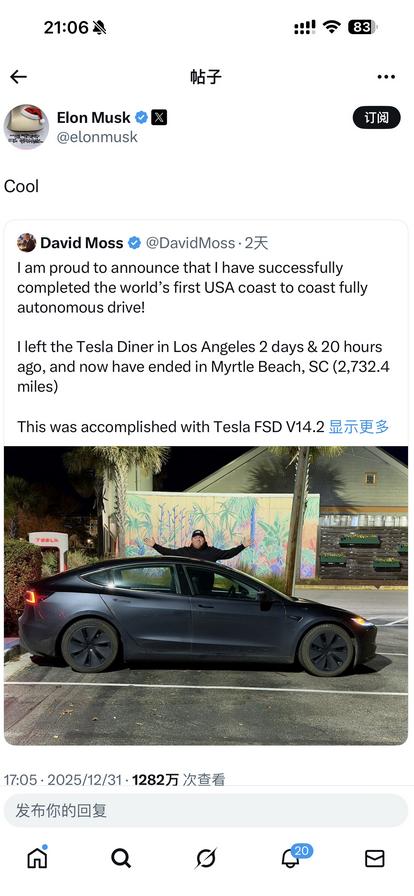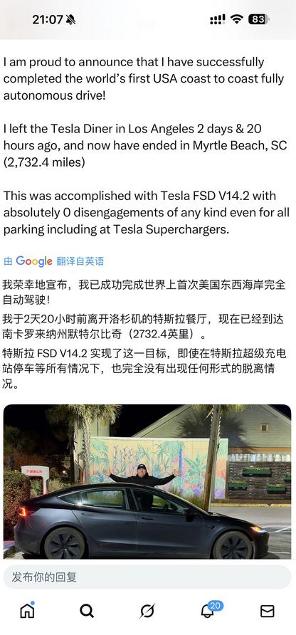 美国一哥们开特斯拉,完成世界上首次美国东西海岸完全自动驾驶,总计里程2732.4英里,约4000多公里,全程0接管。 华为敢不敢挑战一下? 点个关注吧!汽节车社,车圈热点资讯每日一扫清!【来自懂车帝车友圈】