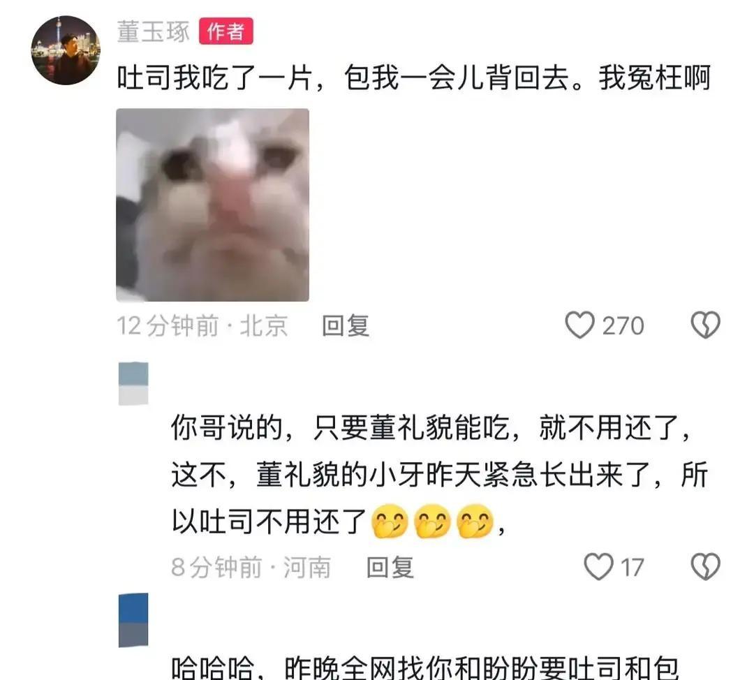 宇辉追着董董要吐司样品,说品牌方要回收。 董董没回消息,直接发视频:小狗礼貌抱着雪饼啃得欢,配文长牙期管不住。 网友秒懂,弹幕刷屏“狗背锅”宇辉直播被弹幕围攻,只好笑着说样品当赞助礼貌成长基金,还要给狗发员工证。 一块面包变成全网狂欢,连宠物专家都出来科普幼犬不能吃人食。 小事闹大,靠的其实是人情味。