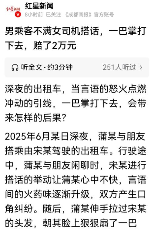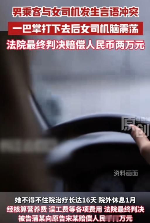 12月10日报道,湖北恩施,一女出租车司机,在深夜搭载了两名男乘客。途中,女司机听两乘客聊的很是热闹,就顺着两人的话题搭上了话茬,没想到,惹怒了其中一名乘客,他拉住女司机头发,朝她的脸上狠狠抽了一耳光。女司机被诊断为脑震荡、多处软组织损伤,耳鸣,为此住院16天。事后,女司机找对方赔偿无果,一怒之下将其告上法庭,索赔各项损失2万余元。网友:一巴掌,从此让双方都长了记性! 2025年6月的一个深夜,湖北恩施的街头已经很安静了,大多数人都回家休息了,可宋大姐还在开着出租车跑夜班。 她干这行好几年了,人爽快、话也不多,遇到愿意聊天的乘客,偶尔接两句茬,在她看来再正常不过。 可她怎么都没想到,就因为这么一句随口的话,自己会挨一顿打,还在医院里躺了半个多月。 那天晚上十一点多,她接上了两名男乘客,其中一个姓蒲,和朋友一起坐在后排,一路上两人聊得挺热闹,说的都是些日常琐事,气氛看着也不紧张,宋大姐听着顺耳,就顺着话题搭了一句,语气也没冲,更没有不尊重的意思。 偏偏就是这句话,让后座的蒲某突然变了脸。他当场就不高兴了,觉得一个司机插嘴,是在多管闲事,打断了他和朋友聊天的兴致,说话也开始冲起来。 宋大姐一下子有点懵,心里想着不过是随口一句,又没骂人、没挑事,就低声解释了两句,想把话圆过去,可她这一解释,反倒把蒲某的火彻底点着了。 车子还在慢慢往前开着,蒲某突然往前一探身,一把揪住宋大姐的头发,另一只手抡圆了,狠狠朝她脸上扇了一巴掌,那一下又响又狠,车厢里“啪”的一声,特别刺耳。 宋大姐只觉得脑袋猛地一震,耳朵里嗡嗡直响,半边脸瞬间火辣辣地疼,眼前都发花了,方向盘差点没握稳,她强忍着不适,把车靠边停下,第一时间报警。 警察很快赶到现场,把动手的蒲某带走调查,宋大姐则被送去了医院,起初她还以为只是挨了一巴掌,休息一下就能好,可检查结果出来后,她和家里人都傻眼了。 医生诊断为脑震荡,伴随多处软组织损伤,还有持续性耳鸣,医生明确表示,这种情况不能大意,必须住院观察治疗。就这样,宋大姐在医院一住就是 16 天。 出院时,医生又专门叮嘱,回家后还要继续休养至少一个月,注意营养,避免劳累,这也意味着,她将近两个月时间没法再开出租车,唯一的收入来源直接断了。 住院期间的医疗费、护理费,再加上这段时间的误工损失,账一算下来,数目并不小。 身体稍微恢复后,宋大姐主动联系了蒲某,想坐下来把赔偿的事情谈清楚,她的想法也很简单:不狮子大开口,只要求把医疗费、误工费这些实实在在的损失补上,总共算下来两万多块。 可蒲某的态度,让人彻底心寒。 他承认自己动了手,却坚称宋大姐“治得太夸张”,说什么“一巴掌能有多严重”,还反咬一口,说她是故意夸大病情想多要钱,几次沟通下来,他一分钱都不肯赔。 协商无果,宋大姐也不再抱幻想,她把医院的诊断证明、缴费清单、误工证明等材料一一整理好,直接向法院提起了诉讼。 到了法庭上,蒲某还是老一套说辞,坚持认为宋大姐“过度治疗”,想把责任往外推,但法院审理案件,从来不是听谁嘴硬,而是看证据。 法官当庭指出,宋大姐的治疗方案是正规医疗机构根据病情制定的,具有专业依据,蒲某只是凭个人主观猜测,就认定对方没必要住院,却拿不出任何医学或法律证据,这种抗辩理由站不住脚。 同时,整个事件中,宋大姐只是正常行车、随口搭话,并不存在任何过错,而蒲某当众动手打人,事实清楚、责任明确,理应承担全部侵权责任。 最终,法院依法核算了宋大姐的医疗费、营养费、误工费等各项合理损失,判决蒲某赔偿人民币两万元。 判决书到手的那一刻,宋大姐心里压着的那块石头,总算落了地,这两万块钱,不只是钱的问题,更是对她这段遭遇的一个交代。 事情传到网上后,网友们纷纷表示解气。有人直说:“这一巴掌真不便宜,两万块钱买个教训。” 也有人感慨:“出门在外,嘴上冲动已经够糟了,动手更是必输,法律面前没有侥幸。” 说到底,这本来就是一件完全可以避免的小事,宋大姐或许也从中提醒自己,夜班接单时要更注意安全和分寸,而蒲某付出的代价更重,一时情绪失控,不仅要掏钱赔偿,还留下了实实在在的违法记录。 这一巴掌,让宋大姐记住了深夜跑车要多留心,也让蒲某真切体会到了暴力的成本。 两万块钱的判决,同样是在提醒所有司乘人员:彼此尊重是底线,遇事冷静,才是最起码的处事方式。 对此你怎么看? 信源:红星新闻