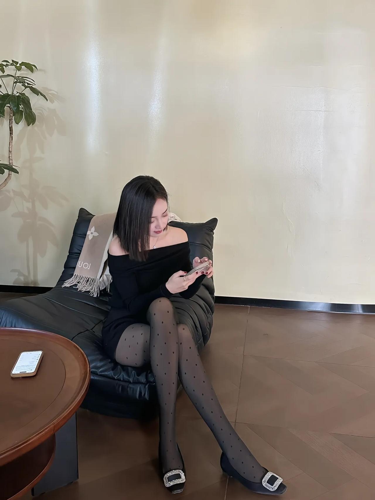 优雅黑裙搭配,时尚手机自拍,享受宁静时光。
