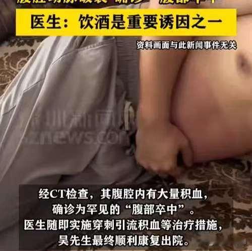 “悲剧还是发生了!”近日,福建泉州,一30岁男子特别喜欢喝酒,这天他更是与朋友喝了一个通宵。不曾想回到家中后竟腹痛难忍,开始以为自己只是吃得不舒服了,于是硬生生扛了8小时才就医,没想到竟引发腹腔动脉破裂,医生:“腹部卒中”! 据媒体1月7日报道,这名男子当天跟朋友从晚上喝到第二天大清早,白酒啤酒混着往肚子里灌。散场后自己晃悠着回家,刚躺床上,肚子就疼得钻心。他觉得就是喝多了肠胃不舒服,忍忍就过去了,没当回事。 疼劲儿一点没减,反而越来越厉害。他蜷在床上动都动不了,冷汗把衣服都湿透了。家里人看他脸色白得像纸,追问才知道他已经硬扛了8小时,赶紧打120送医院。 检查结果出来,医生说这是腹腔动脉破裂,也就是腹部卒中。这病和脑中风差不多,血管破了之后腹腔大出血,死亡率特别高。医院赶紧安排手术,忙活了好几个小时,才算把他从鬼门关拉回来,直接送进重症监护室。 医生说,通宵喝酒就是直接原因。酒精把血管刺激得扩张,血压忽高忽低,再加上空腹喝酒让肚子压力变大,动脉壁直接扛不住就破了。最要命的是,这8小时耽误了最佳抢救时间,治疗难度一下子就上去了。 最近这种事真不少。2025年12月20日,长沙一个小伙子喝醉酒后又吐又晕,送到医院时心脏都停了,医生从他气管里掏出好几块肉片子才救活;2026年1月12日,南通一个28岁小伙喝了快两斤白酒,当场口鼻喷血进了ICU,气管里还卡着豆芽。 网上吵翻了。有人说明知道喝酒伤身还不收敛,纯属自己找罪受;也有人叹气,说上班应酬没办法,想不喝都不行。但说到底,拿健康换面子,根本不值。 酒后肚子疼绝对不是小事,可能是急性胰腺炎、腹腔动脉破裂这些要命的急症。这些病一开始就是肚子疼,拖着不治,最后可能连命都没了。 硬扛身体不舒服,说白了就是侥幸心理。总觉得小毛病自己能好,却不知道这些急症的黄金抢救时间就短短几个小时。身体发出的警告,一次都不能不当回事。 遇到别人劝酒,该拒绝就拒绝,这不是没面子,是对自己负责。酒后要是突然肚子疼,必须第一时间去医院,别拿命赌运气。 最后想问大家,有人劝酒说“不喝就是不给面子”,你会怎么回?酒后肚子疼,你会马上就医还是硬扛?评论区说说想法,也提醒身边人,喝酒真不是小事,健康才最重要! 信息来源:《[30岁男子通宵喝酒,回家后肚子疼硬扛8小时腹腔动脉破裂]