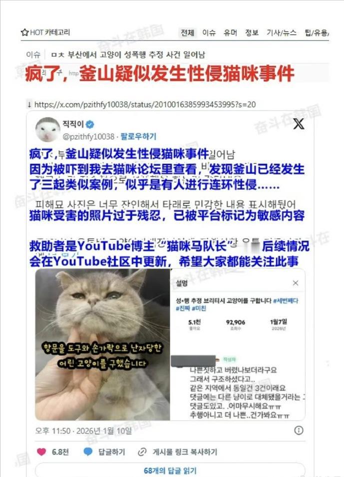 韩国釜山发生连环疑似小猫被施害事件,推网友发出当地猫咪论坛接连出现三起同类恶行,有人对幼猫下狠手,小猫遭非人摧残。 被救助的小猫肛门处有遭工具和手指严重摧残的痕迹,伤势触目惊心,光是看文字描述都让人浑身发冷。难以想象这些小生命在遭遇暴行时,有多恐惧、多痛苦! 棒子这波操作,真能和阿三坐一桌了。连毫无反抗能力的幼猫都不放过,心里得扭曲到什么程度了,都不能称之为人了吧!