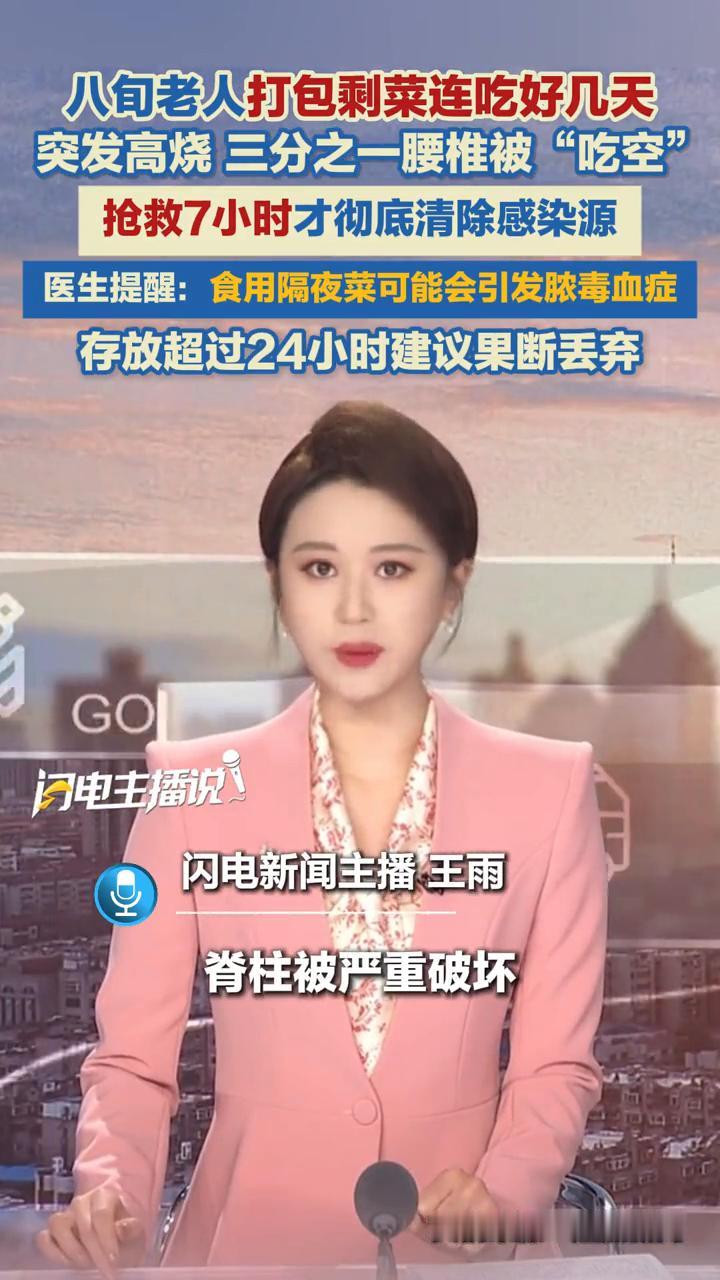 八旬老人打包剩菜连吃好几天,突发高烧三分之一腰椎被"吃空",抢救7小时才彻底清除感染源。 老人打包剩菜连吃好几天,突发高烧三分之一的腰椎被"吃空",医生抢救7小时。近日陕西西安82岁的老李打包了一盘手抓羊肉,连吃了好几天突然高烧寒颤,全身抽搐。送医后才发现因为严重感染,老李有三分之一的腰椎被"吃空",同时伴有严重的脓毒血症、化脓性脊柱炎、腰大肌脓肿,大量脓液蔓延至腹腔,脊柱被严重破坏。 西安国际医学中心专家团队经过7个多小时的手术才彻底清除感染源。医生提醒:隔夜菜在存放过程中容易滋生大量细菌,如大肠杆菌、沙门氏菌等,食用后可能会引发脓毒血症,尤其老年人免疫力较低,更易发生此类严重感染。剩饭剩菜尤其是肉类和豆制品不要反复加热食用,存放超过24小时的饭菜建议果断丢弃。