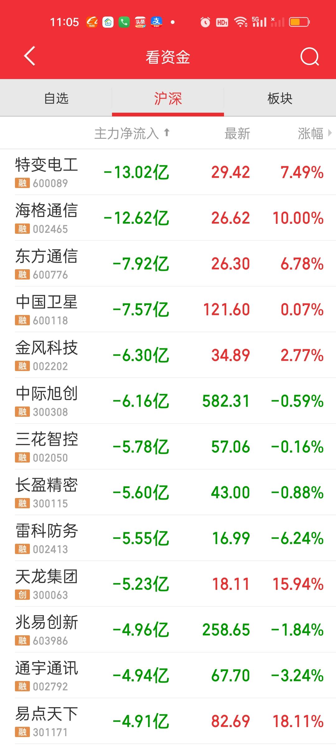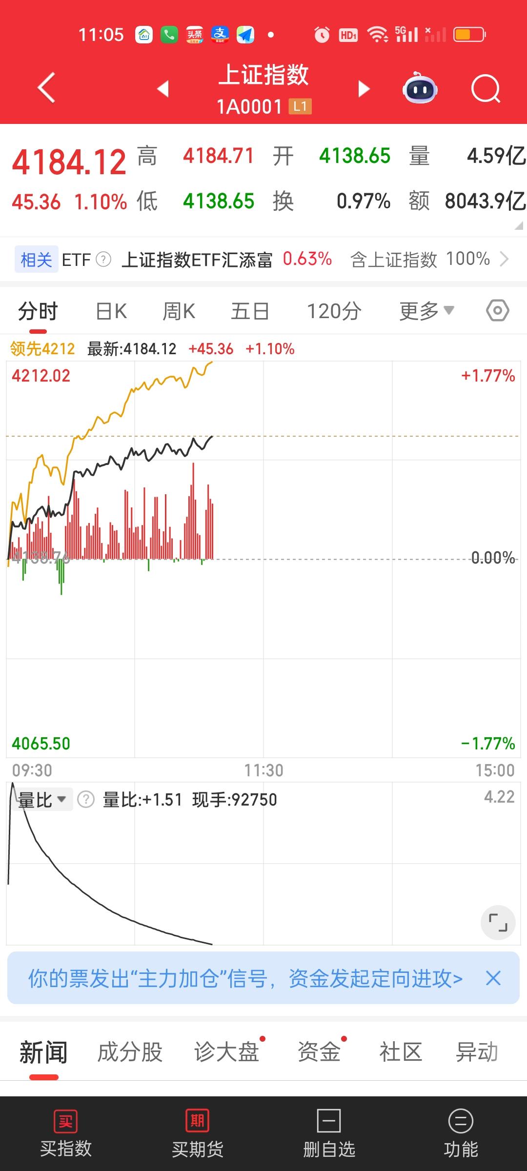 终于看到大盘资金净流入了,指数也是再创新高。来到了4190.87,但今天有个很明显的迹象,成交量开始缩量了,目前缩量了2300亿,这肯定不是好事情,量能是指数能够上涨的前提,一旦资金开始退潮,短时间内恐怕很难再聚集。 个股有接近4700家上涨,涨跌停比96:6,今天赚钱效应还是很好的,但这个位置不建议追高了。因为向上的空间很有限而向下的空间我们按照4030的平台上沿来算有160点的空间。现在追进去不管从哪个角度讲性价比并不高!