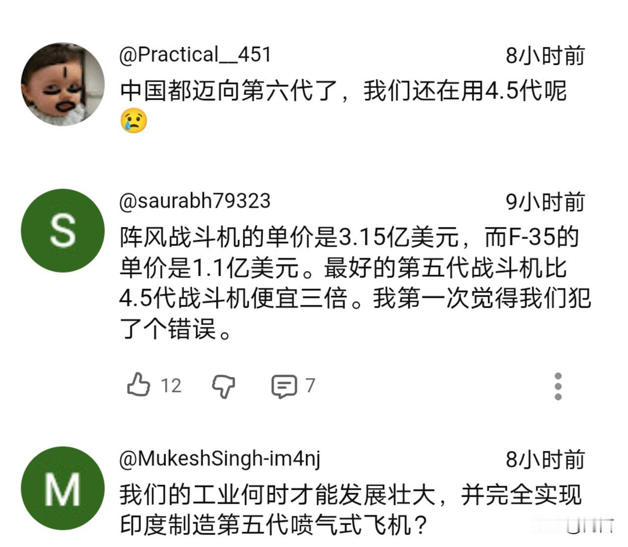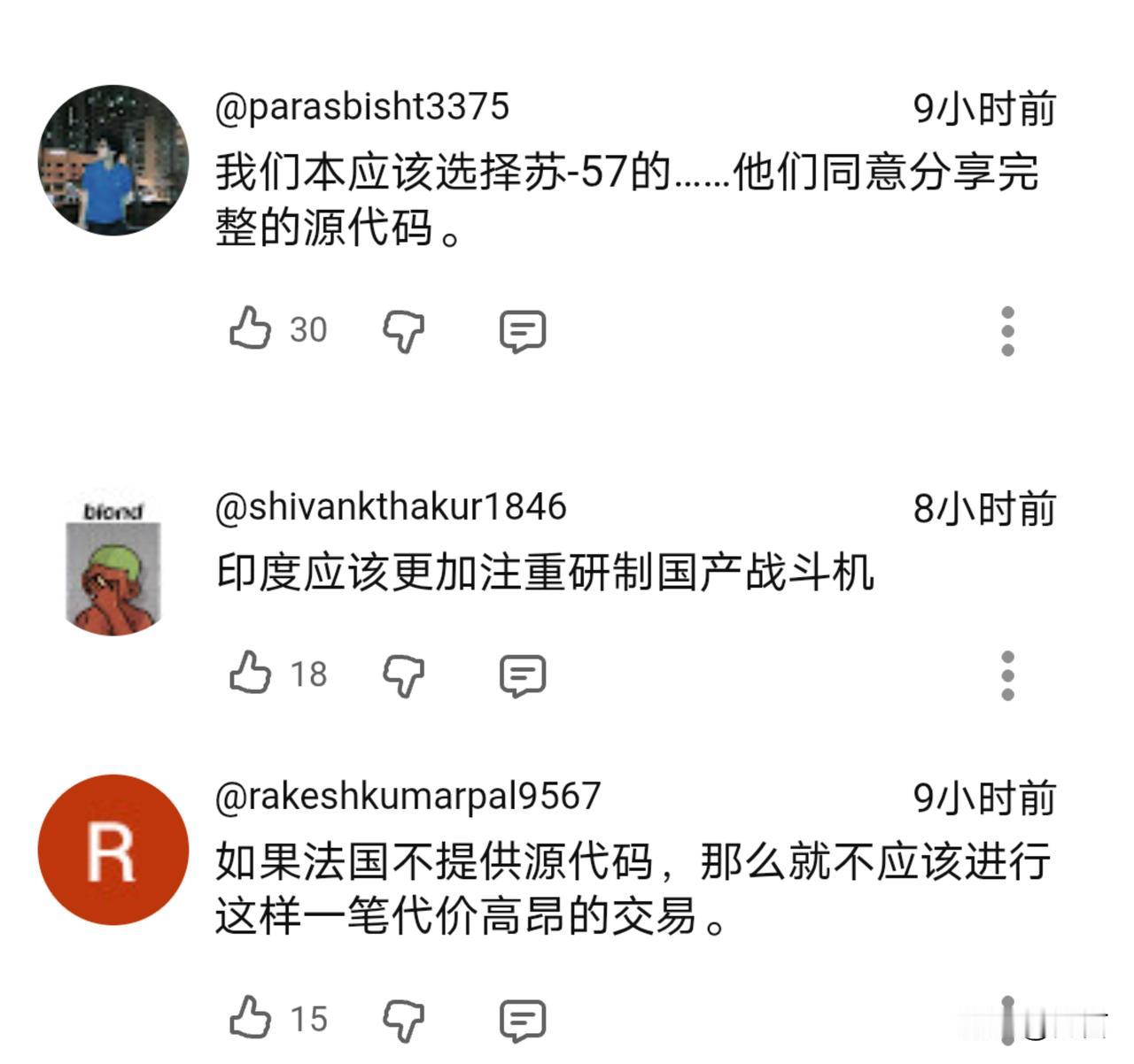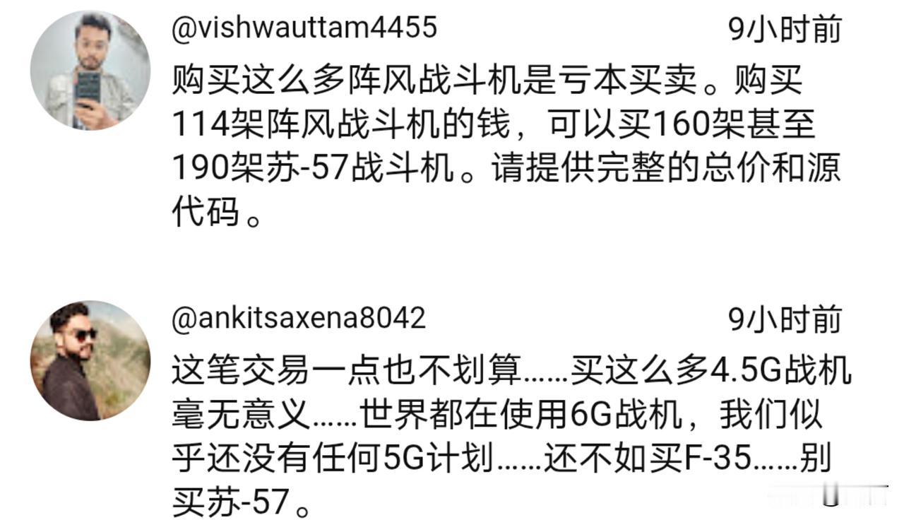 关键细节曝光!印网友:还不如购买俄罗斯的苏57战机。 据一位印博主1月13日透露,法国达索航空不会向印度转让阵风战机源代码等在内的核心技术。同时印方期待的60%的国产化率,也仅有30%。 印度计划耗资240亿美元向法国订购114架阵风战机,借此补充机队和提升航空工业的水平。尽管印方抛出了巨额订单,可结果却未能如愿。 飞机贵不说,还没得到想要的技术。闻讯后的印度网友自然不淡定,他们认为,与俄罗斯合作才是最佳的选择…