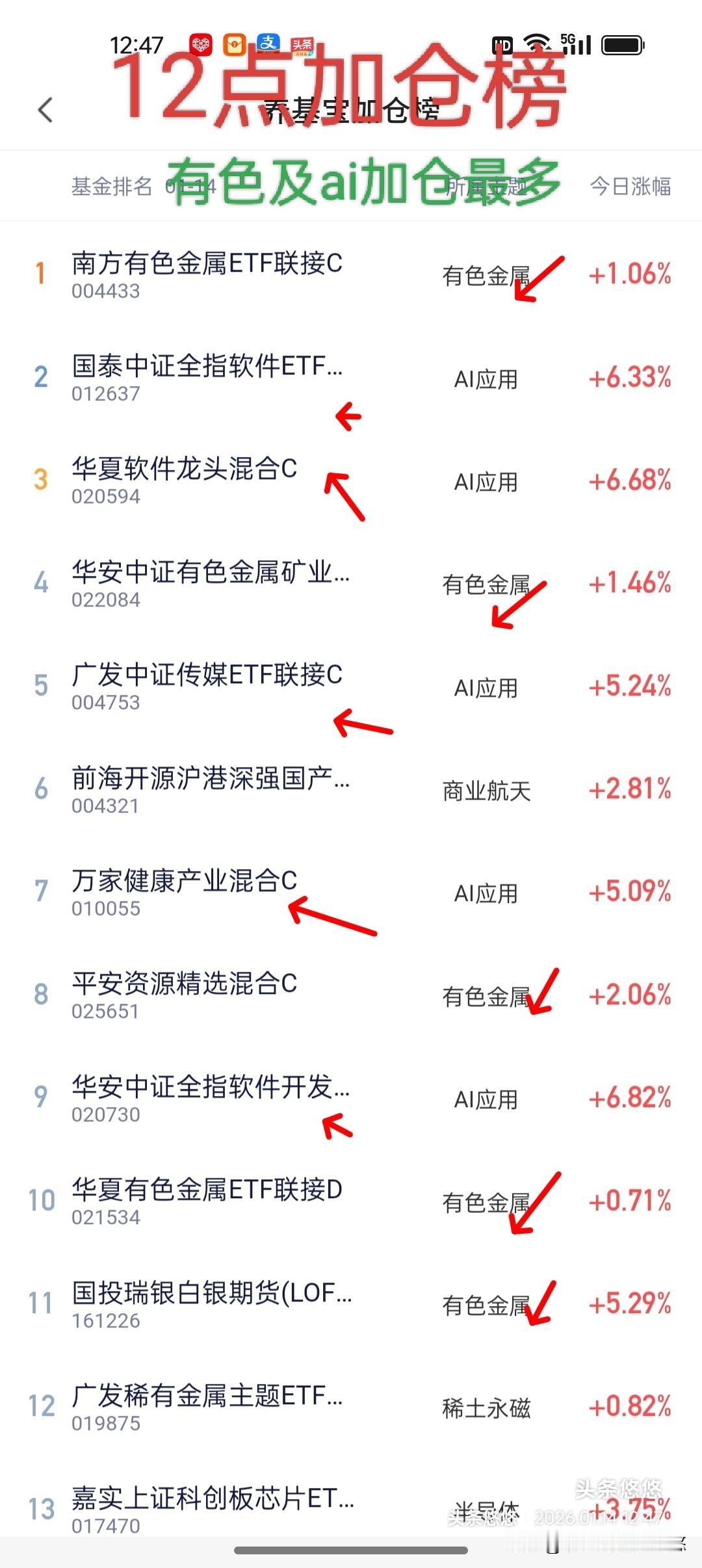 14基金操作观点及加仓榜 今天反包昨天阴线,强势不改,行情起来根本压不下去,昨天的大阴线吓跑一批人,今天还得追进来。多次提示,回调就是介入机会,可是还是有不少人反向操作,韭菜命苦啊! 板块热点还是Ai,传媒游戏软件板块,人工智能,云计算,科创板,可控核聚变,卫星通信,半导体芯片,科技板块,前期提示的金融科技后来者居上,游戏板块已经连续上涨10天!你手里只要持有以上板块基金,应该跑赢大盘及多数人。 昨天我把汇添富中证电池及中航机遇领航大部分转到其它板块,看目前是对的,还是心不狠,没有转完! 恒生科技震荡上行趋势,可继续持仓待涨。 港股通创新药(包括a股创新药),上涨趋势,持仓待涨。 卫星航天,传媒游戏,软件ai,云计算,科创人工智能,半导体芯片,可控核聚变等热门赛道,可根据自己的情况决定---是分期止盈、还是持仓待涨、还是追高介入。不建议清仓式止盈,这样很容易踏空。赚不到后期盈利。 人形机器人,中规中矩,不热不火,可继续持仓待涨。 北证50,即将突破,开启上行趋势,坐稳扶好,前几天分析提示,有没有上车的? 踏上主力的顺风车,稳稳的幸福,跟着主力走,想啥都能有啊! 行情没有走完,大家可以持仓待涨,技术好的可以高抛低吸,否则卧倒等涨。 风险提示:注意止盈,不要只想着往里冲! 以上观点仅供参考不构成投资依据,点赞转发关注投资理财不迷路。