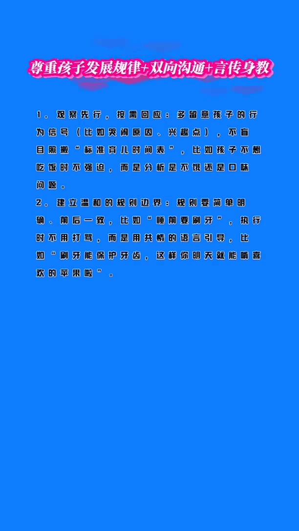 尊重孩子发展规律+双向沟通+言传身教。 ·1.观察先行,按需回应:多留孩子的行为信号(比如哭闹原因、兴趣点),不盲目照搬"标准育儿时间表",比如孩子不想学习,而是分析是不饿还是口味问题。 ·2.建立温和的规则边界:规则要简单明了,不用打骂,而是用共精的语言引导,比如"刷牙能保护牙齿,这样你明天就能听喜欢的苹果啦"。 ·3.多做高质量陪伴:放下手机,每天留10-20分钟专属时间,陪孩子玩积木。读绘本或户外宾跑,互动中多听孩子表达,少用"你应该"-不许"这类指令。 ·4.允许孩子试错成长:孩子自己穿衣服,收拾玩具时,腰怕做得慢或出错,也别急,看代势,试错的过程能帮他建立独立能力和抗挫折力。 ·5.家长做好精绪管理:面对孩子的调皮或哭闹,先稳住自己的精绪,再处理问题,避免情绪化说教,你的情绪稳定,是孩子安全感的重要来源。