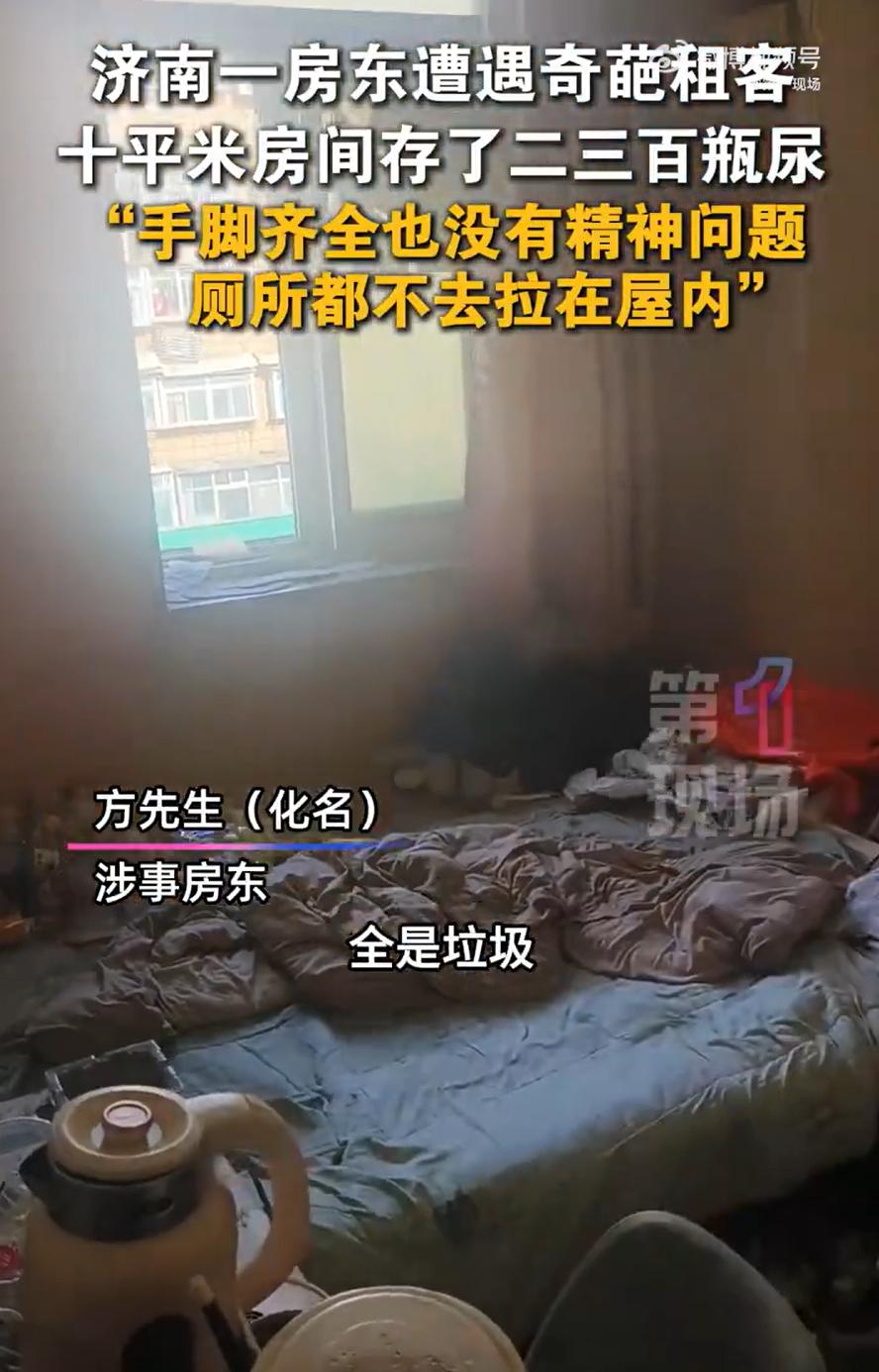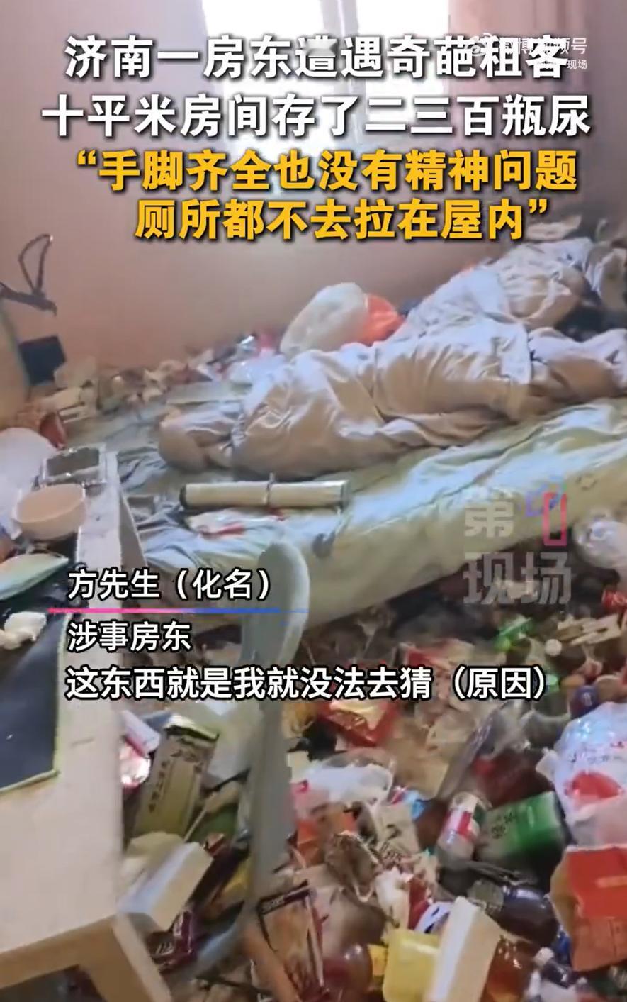 太奇葩了!山东济南,一位房东把房子租给了一名男租客,可没想到,对方却突然欠租失联,等他把屋门打开后,里面的情况相当辣眼,租客竟然给他留下了几百瓶尿液和粪便,房东怎么也想不明白,明明有厕所,他为什么就不去 房东介绍,房子是合租的,老房子,但该有的都有。之前另一个租客到期搬走,临走给房东发消息,说不续租了,原因是觉得屋里太脏。房东当时还纳闷,老归老,但也不至于脏到住不下去吧? 等他联系那个中年男租客,发现电话不通、信息不回,租金也拖了好一阵子,这才觉得不对劲,赶紧拿钥匙开门去看 这一看,他整个人都懵了 十来平米的房间里,到处是外卖盒子,里面装的不是剩饭,竟然是粪便。地上还摆满了各种瓶子,矿泉水瓶、饮料瓶、大大小小的桶,差不多有二三百个,里面全是尿。屋子里那股味儿,隔着口罩都冲鼻子 最让房东想不明白的是,这房子里明明有厕所,水龙头也能出水,马桶也能冲,可这租客偏偏不用。他就这么在屋里“解决”,然后存起来,摆了一地 房东后来回忆说,这租客看起来挺正常,手脚齐全,说话也清楚,不像有精神问题。可就是想不通,他为什么要这样过日子?好好一个房间,硬是住成了垃圾场 最后房东没办法,自己掏了400块钱请保洁来收拾。保洁阿姨进门都直摇头,收拾了大半天才勉强清理干净 说起来,一个人选择在这样的环境里生活,大概率不是因为他喜欢这样,而是某种生活状态或心理状态已经失控了。也许他遇到了什么难处,也许是长期孤独、压抑,导致对生活环境彻底无所谓了 这也提醒咱们,租房这件事,不管是租客还是房东,都不只是钱和合同的关系。房东在出租时,除了收租金,偶尔也得多关注一下房子的状况和租客的状态,这不是多管闲事,而是避免后续更大的麻烦 当然,话说回来,不管遇到什么情况,把房子住成那样,还给别人添这么大麻烦,确实不应该。租房是临时的家,但“家”这个字,意味着基本的整洁和尊重