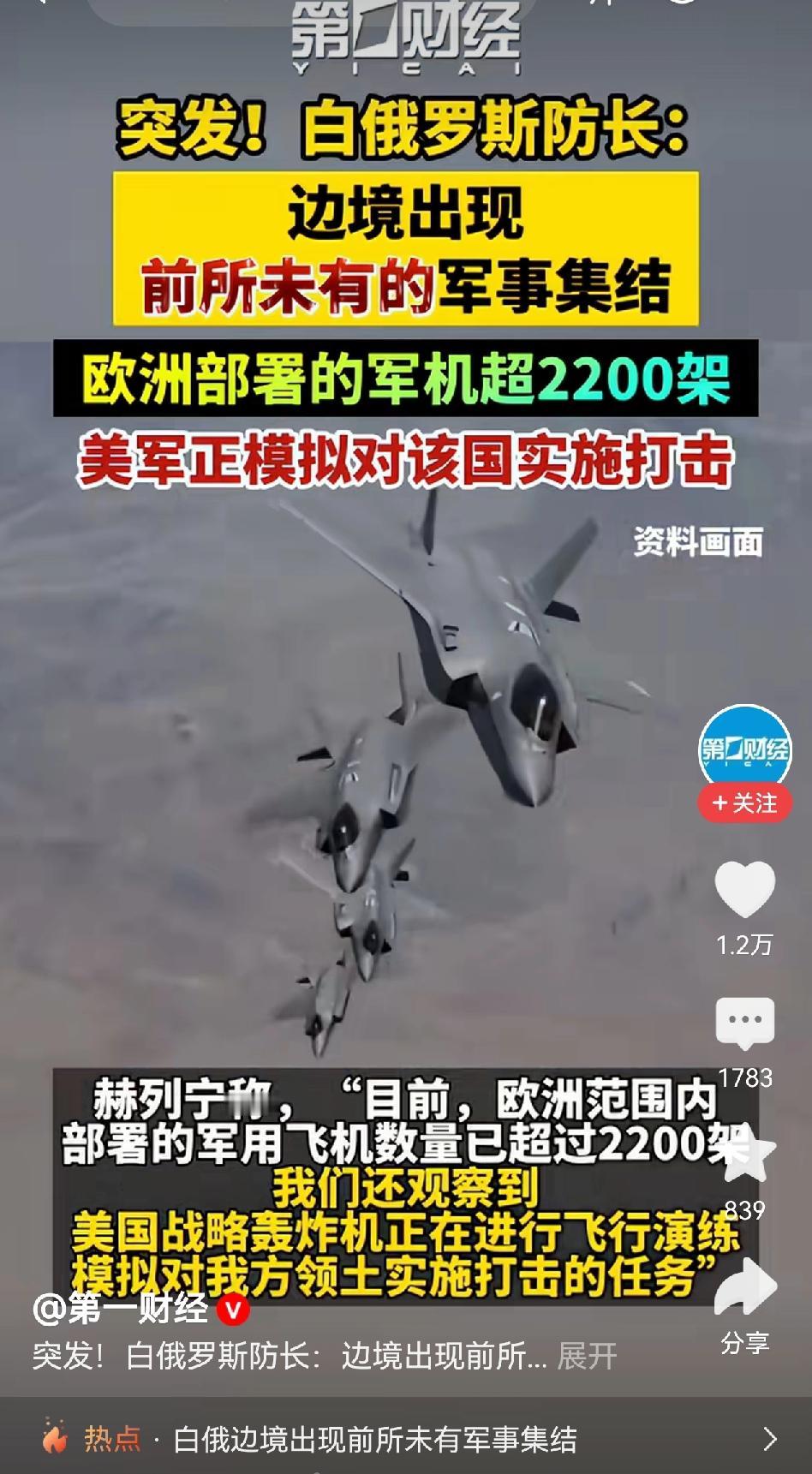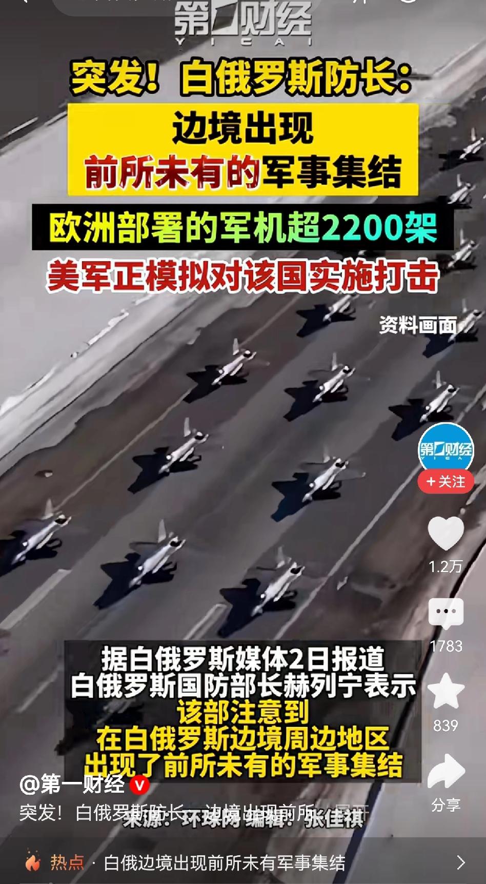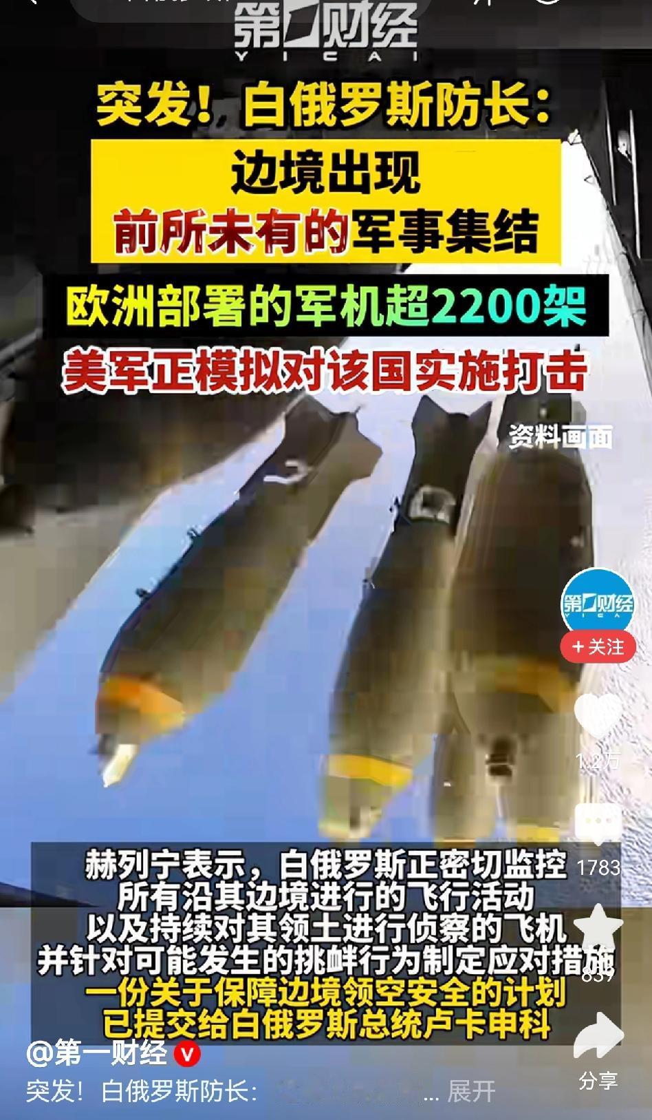 一波未平,一波又起,2000架欧美战机齐聚边境,难道白俄罗斯也悬了? 看这大兵压境的架势,卢卡申科和普京不得不防啊。 不过,我认为,美国绝对没实力双线作战。项庄舞剑,意在沛公,老美这不过是在敲山震虎,提醒大毛、三毛,守好本份,看好家门,不要在伊朗问题上乱伸援手。 所以,老美这次玩的是声西击东的招,西边白俄这边是虚招,东边伊朗这边是实招,卢卡申科是真不用慌。 但,哈梅内伊,不慌,行吗? 还是抓紧准备迎战吧!不要又被美以胖揍一顿,面子里子都丢大了。