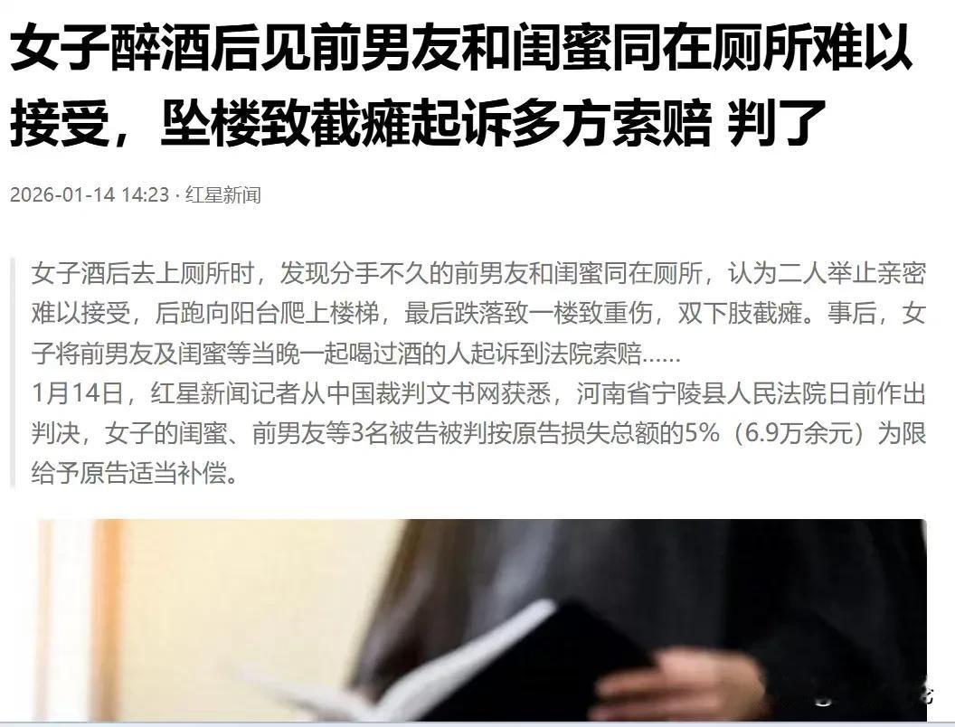 河南宁陵,女子和前男友,闺蜜,朋友一起吃饭喝酒,女子醉酒,迷迷糊糊睡了一觉,起来上厕所,居然在厕所看到,闺蜜坐在前男友的腿上,有亲密的举动,她当时就受不了了,跑上楼顶,一跃而下,导致胸部以下瘫痪,于是她起诉前男友,闺蜜和朋友要求赔偿43万余元。 王女士和薛先生分手了一个月,依然难以释怀,心中始终装着薛先生,甚至希望两人有朝一日能够复合,却没想到一场醉酒,她看到了前男友和闺蜜在一起的画面,让她付出了沉重的代价。 事发当天,王女士的闺蜜郭女士,约了一个姓李的共同的朋友出来吃饭喝酒。 这个朋友和薛先生也是好朋友,当时两人一起过来了,过来之后,薛先生没想到看到了自己的前女友。 四人都是老相识,相识一场,相恋一场,在四人的聚会中,王女士和薛先生倒也没有因为他们分手的事情,影响到他们的心情,4人吃饭喝酒还是聊得很开心的。 难得王女士和薛先生,没有因为分手的事情闹别扭,4人愉快地喝到酒足饭饱才离开。 或许是王女士因为分手的事情影响了心情,她无意当中就喝了很多酒。当然她在喝酒的过程中,没有人劝她喝,是她一个劲地喝,把自己喝醉了。 薛先生,郭女士,还有那位姓李的朋友,一看王女士喝醉了就叫了代驾将她送回了家。 回家之后,王女士晕乎乎的,直奔卧室就睡觉,此时她的前男友,闺蜜以及姓李的朋友,在外面聊天。 王女士睡了一觉,感觉自己才缓过神来,但是由于喝多了酒,她尿急了,她摇摇晃晃地走到了卫生间,准备上厕所。 结果眼前的一幕,让她崩溃了。 一个是她依然深爱的前男友,一个是她的闺蜜,闺蜜也深知她依然爱着前男友。 可此时她的闺蜜,居然坐在她的前男友的腿上,并且就在她家,还在她的卫生间,有亲密的举动。 看到这一幕,王女士无法接受,她似乎感到了双重背叛,她那么爱前男友,她那么相信闺蜜,他们俩居然在一起了。 王女士一气之下,转身就跑向楼顶,薛先生意识到不对劲,他能感受到前女友心中还有他,所以接受不了眼前的一幕。 他赶紧跟着前女友跑上了楼顶,他赶到楼顶时,他发现前女友已经翻越阳台台阶,正准备往下跳。 他眼疾手快,瞬间抓住了前女友的双手,拼命地往上拉,并且呼喊救人,但是后来还是因为体力不支,王女士坠楼了。 如此一来,王女士这一摔,就摔出了大问题,她胸部以下全部瘫痪了。 一次醉酒,前男友和闺蜜的双重背叛,让她付出了沉重的代价,她想不通,认为这一切都是前男友和闺蜜,以及姓李的朋友导致的,于是她起诉了这三人,要求赔偿43万。 面对王女士的起诉,三人都感到很委屈,他们表示在喝酒的时候他们都没有劝酒,王女士坠楼实在是他们意想不到的。 特别是郭女士,她说当时并没有坐到王女士的前男友的腿上,当时她和姓李的朋友离开时,王女士和薛先生正在聊天,她和李姓李的朋友来到楼下,才发现王某躺在楼下的,作为共同饮酒人,她和姓李的朋友已经安全地将王女士送到家了,她认为她和姓李的朋友没有责任。 薛先生则认为,当时他意识到王女士情况不对劲,已经追了上去,并且抓住王女士的双手进行施救,可意外还是发生了,他认为自己也尽到了救助的义务,所以他也不需承担责任。 但法院经过审理认为,虽然这三人在喝酒的过程中并没有对王女士进行劝酒,但是王女士确实是因为看到前男友和闺蜜在一起的画面,才会情绪激动的。 但是三人和王某存在存在共同饮酒的事实,并且从公序良俗的精神来看,闺蜜坐到王女士的前男友的腿上,这确实对王女士造成影响。 《民法典》第8条规定:民事主体从事民事活动,不得违反法律,不得违背公序良俗。 因此法院判决,郭女士需要给王女士赔偿27,000多元,魏先生需要给王女士赔偿16,000多元姓李的朋友需要赔偿13,000多元。 那么你认为他们需要赔偿吗?