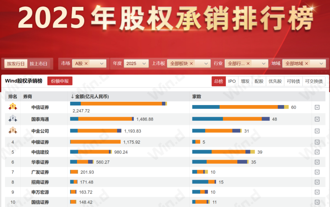 股权承销业务方面,Wind数据显示,2025年中信证券在承销金额及承销家数方面均排在行业首位。