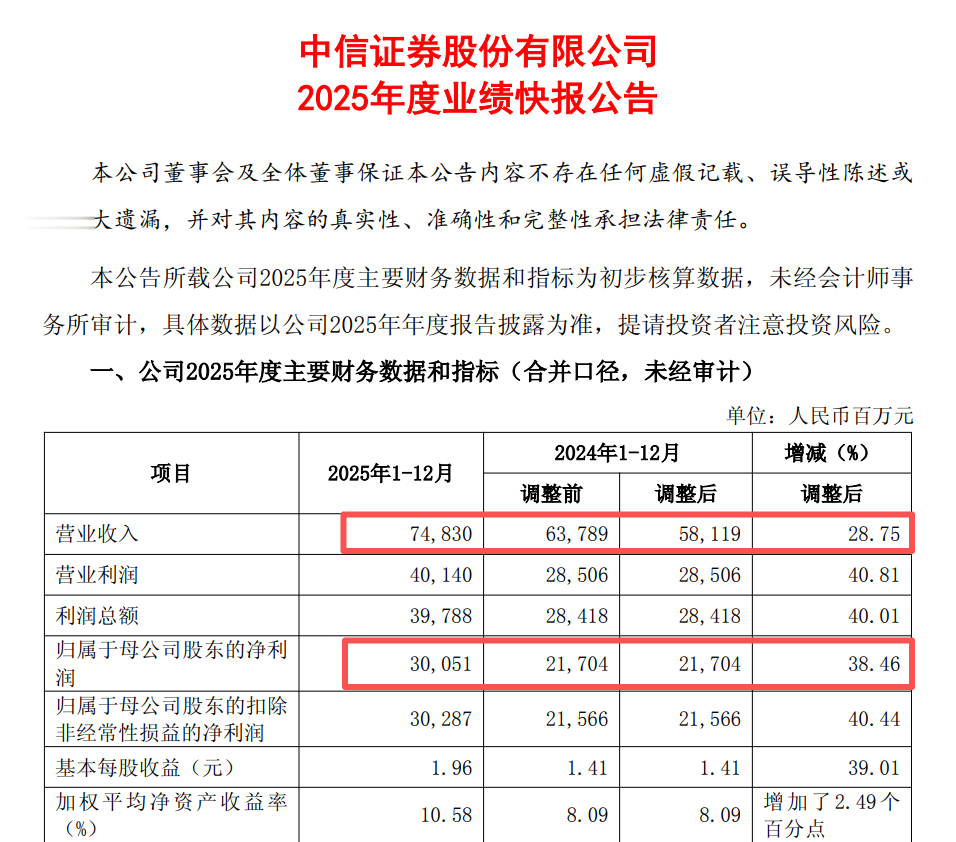 [导读]中信证券发布2025年度业绩快报,全年归母净利润突破300亿元