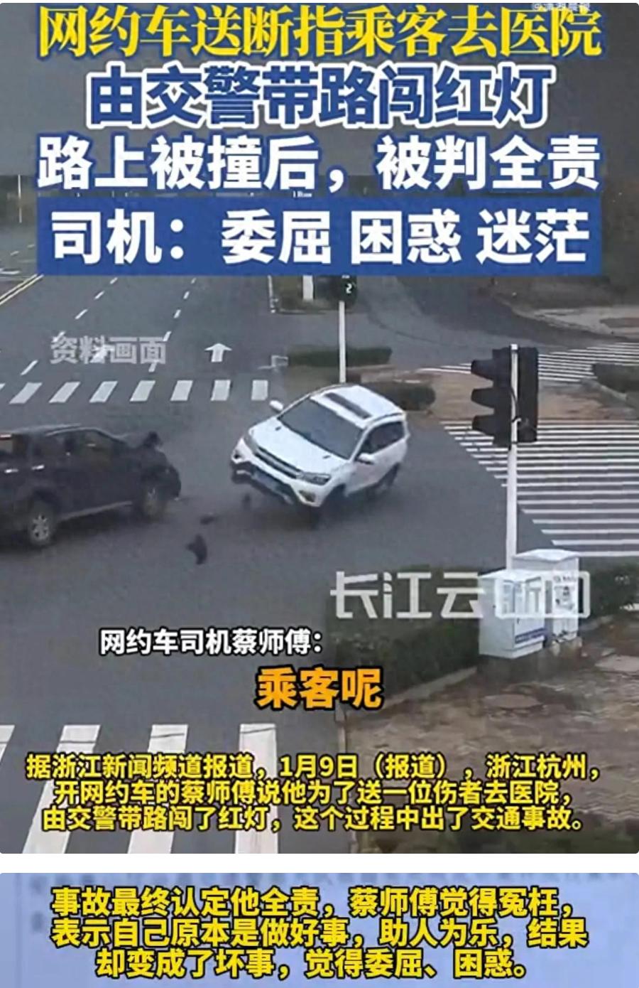 浙江杭州,一网约车司机接到一个紧急订单,一名乘客手指切断,鲜血直流,断指就装在塑料袋里。司机立刻驱车赶往医院,行驶约一公里后,遇到一位身穿“巡防”制服、驾驶闪灯警车的执勤交警。乘客当即求救,交警查看伤情后,通过电话沟通,随即对司机说:“那你们跟牢我”,并记录了他的车牌号。司机紧跟着前方的警车,行至一个路口,前方警车可能已闯红灯通过,司机未加犹豫,紧随其后驶入路口。就在那一瞬间,侧面一辆正常绿灯通行的私家车猛地撞上了他的车。事故后,司机等待一个多月,收到的认定书却判他“闯红灯”负全责。司机不服,提起复核,但结论仍未改变。   近日,一网约车司机蔡师傅接了一个订单,订单目的地显示为一家医院,上车的乘客有三位,气氛明显不同寻常。   其中一位年轻男子脸色苍白,紧紧攥着一只简单包裹的左手,鲜血已浸透包裹的布料,另一位同伴手中还提着一个不起眼的塑料袋,里面装着的,正是男子被切断的手指。   乘客焦急的催促:“师傅,快点,去最近的医院,手指断了!”   蔡师傅心中一紧,一脚油门,车辆朝着医院方向疾驰。   大约行驶一公里后,蔡师傅看到了路边停着一辆警灯闪烁的警车,车旁站着身穿“巡防”字样制服的工作人员。   乘客立即向执勤人员求救,说明情况的紧急性。   蔡师傅也将车停下,交警上前查看了车内情况,确认了伤者断指的危急状况。   在紧急沟通后,这位交警做出了决定,由他驾驶警车在前方开道,引领蔡师傅的车以最快速度赶往医院。   交警对着蔡师傅说:“那你们跟牢我。”还特意记录下了他的车牌号。   蔡师傅打起十二分精神,紧握方向盘,紧随在前方的警车之后。   在仅仅几百米后,通过一个交通信号灯控制的十字路口,前方的警车在信号灯可能已转为红色的情况下,快速通过了路口。   没有丝毫犹豫,蔡师傅本能地选择继续紧跟。   就在他的车辆驶入路口中央的一刹那,侧向一辆正常通行的私家车,避让不及,狠狠地撞了上来。   事故发生后,交警部门依法展开了调查。   等待一个多月后,蔡师傅收到了交警部门出具的第一份《道路交通事故认定书》,认定结果显示,蔡师傅因“违反交通信号灯指示通行”,承担此次事故的全部责任。   这意味着,蔡师傅不仅要自行承担车辆的维修费用,面临下一年度商业保险保费的上浮。   更关键的是,在事故处理及车辆维修时间,他作为家庭主要经济支柱,完全失去了收入来源。   更让他感到心理落差的是,此前不久,有交警中队的民警与他沟通时,曾提及可以为他“申请见义勇为称号”并“给予适当补偿”,但他因觉得与自己巨大的实际损失不匹配而未接受。   转眼间,“可能的荣誉”变成了“确凿的责任”。   蔡师傅认为,他这是助人为乐,是跟着交警开的道,不应该全责。   于是,蔡师傅选择了提起复核申请。   复核机关审查后认为,原事故认定“事实不清”,责令重新调查、认定。   然而,2026年1月初,经过补充调查,交警大队作出了重新认定,结论依旧是,蔡师傅闯红灯,负事故全部责任。   从“事实不清”到“维持全责”,这个结果让蔡师傅更加难以接受。   对此,交警部门的回应称是根据上级复核意见进行补充调查后,依法作出的认定。   那么,从法律角度,这件事如何评价呢?   《道路交通安全法》第五十三条规定,警车、消防车、救护车、工程救险车执行紧急任务时,可以使用警报器、标志灯具;在确保安全的前提下,不受行驶路线、行驶方向、行驶速度和信号灯的限制,……   本案中,蔡师傅虽然是在警车引导下送乘客就医,但始终要在确保安全的前提下进行,否则依然会构成违反交通规则。   交警的引导,可能在事实层面强化了蔡师傅“此时通行被允许”的认识,构成了其违法行为的诱因之一。   在法律评价上,这可能成为一个酌情情节,但在现行交通事故责任认定框架下,它并不能直接否定或抵消蔡师傅作为驾驶员的最终安全驾驶责任。   交警部门依据《道路交通安全法》等规定,认定蔡师傅负全责,是在法律框架内可以做出的、具有依据的决定。   不过,《民法典》第一百八十二条规定,因紧急避险造成损害的,由引起险情发生的人承担民事责任。危险由自然原因引起的,紧急避险人不承担民事责任,可以给予适当补偿。   蔡师傅的行为是见义勇为无疑,其在按责任认定书赔偿对方损失后,可以基于“紧急避险等相关法律规定,向受益的受伤乘客主张补偿其自身遭受的损失,如车辆维修费、误工费等。   此外,如果调查证实交警在引导过程中存在重大过错,那么根据《国家赔偿法》相关规定,交警部门可能因其履职过程中的过错,对蔡师傅的损失承担相应的行政赔偿责任。   接下来,蔡师傅或可另行提起行政赔偿诉讼寻求救济。   对此,您怎么看?