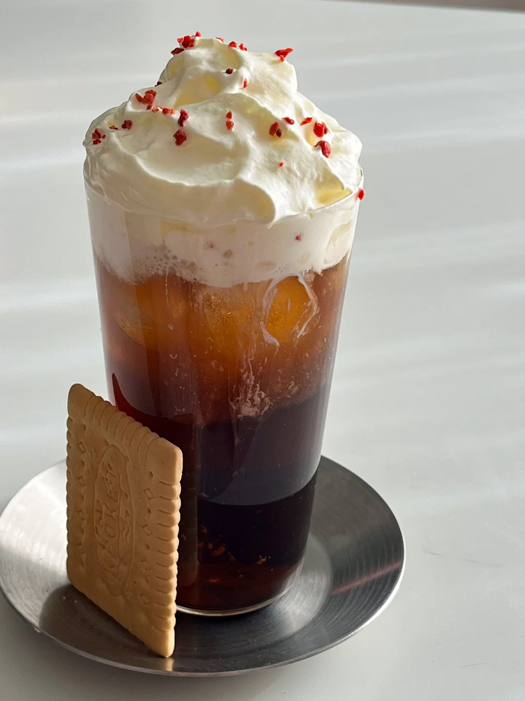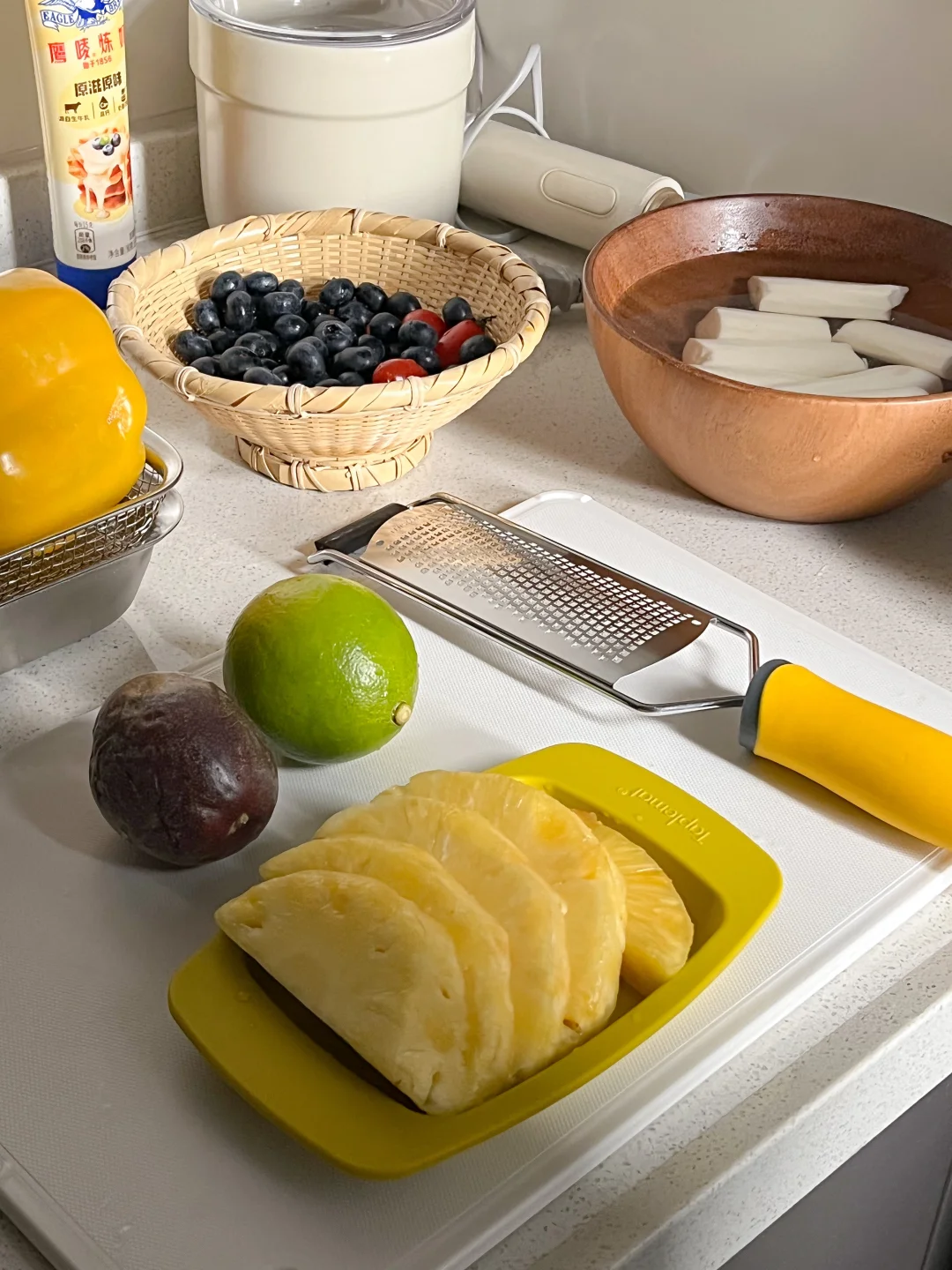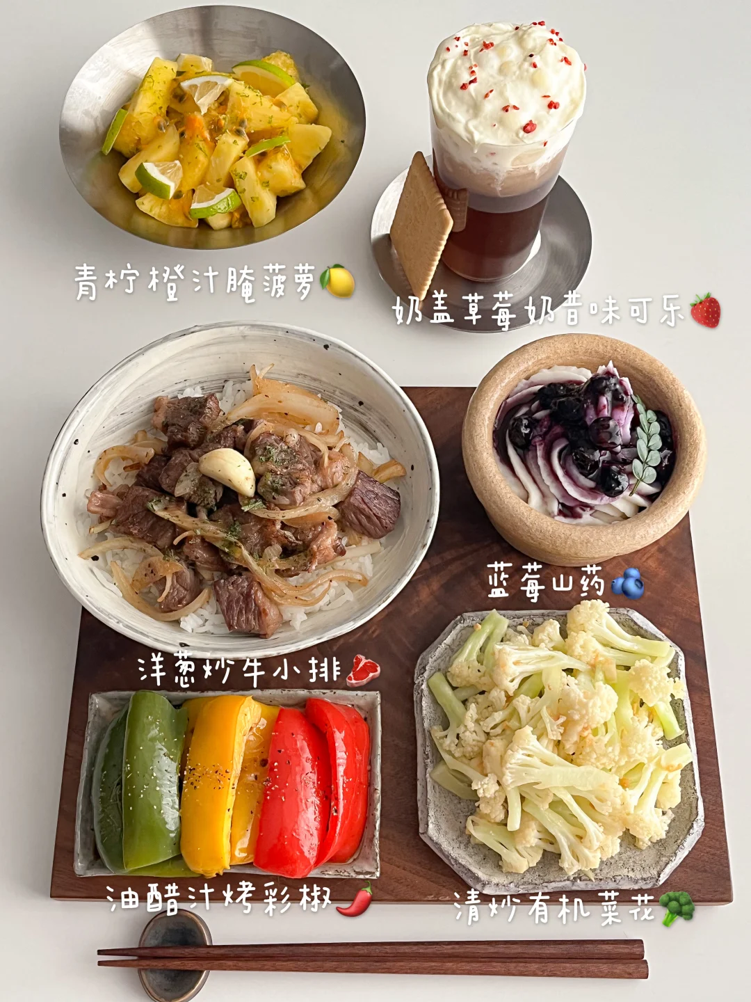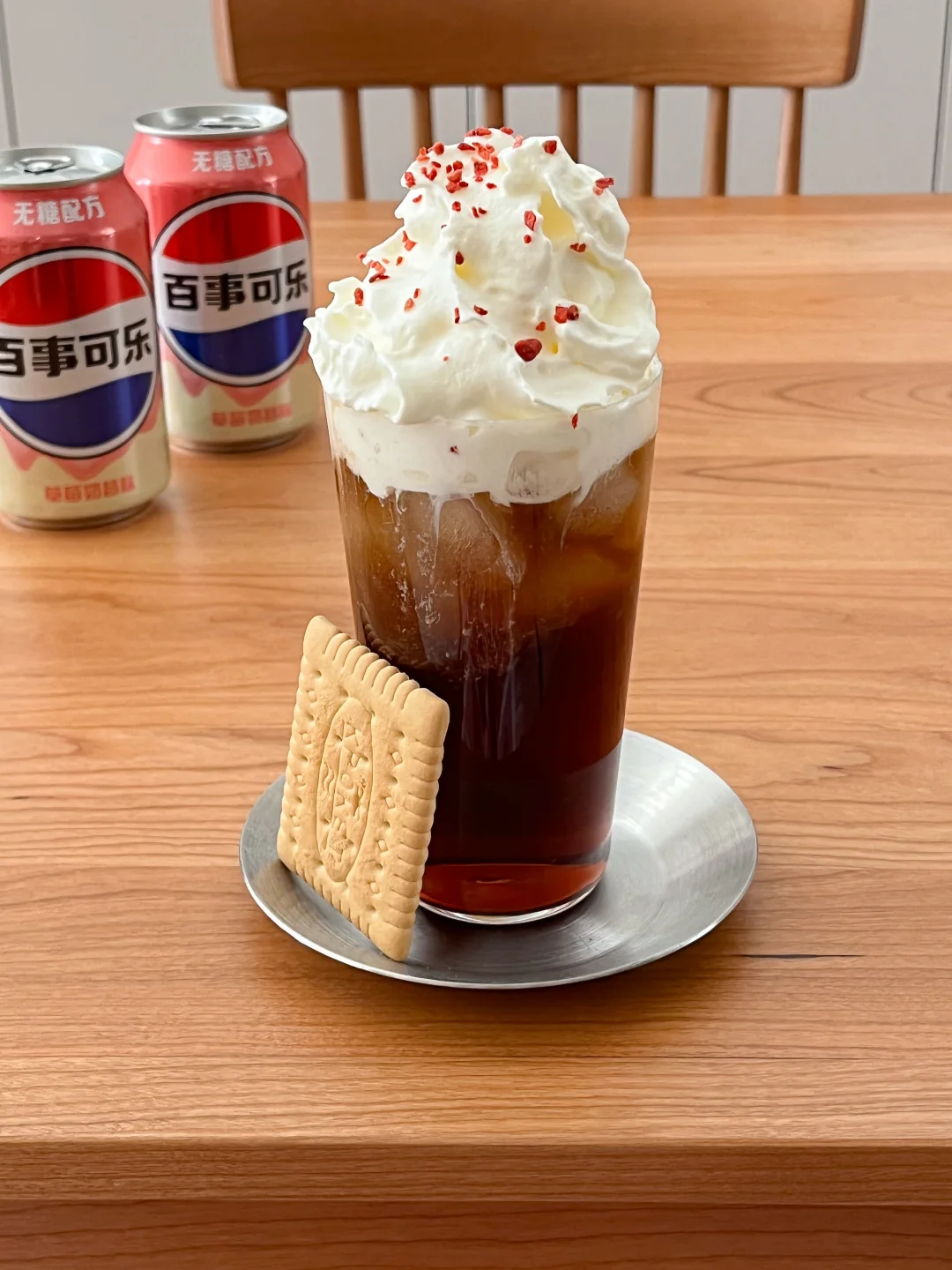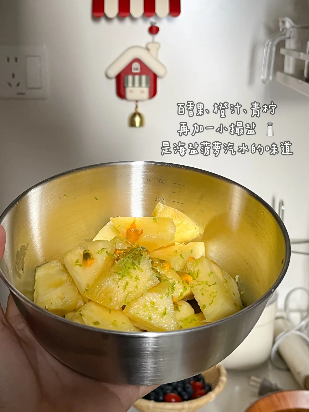 这几天大降温 外面到处都是雪 冬天就总想吃点酸甜儿的 那就做个腌菠萝吃吃~ 之前做的感觉不怎么入味 只有菠萝味 今天改良了配方 额外加了点橙汁 熟透的菠萝更香甜 盐加一小搓 灵魂所在 放冰箱里腌2个小时 清爽冰糖感 就像喝海盐菠萝汽水一样 作为一个可乐十级爱好者 每次逛超市发现新口味都得试一下 居然有粉红色的草莓奶昔味可乐 百事你是懂少女心的🫶 鲜奶油+草莓碎给可乐做一个奶油帽子 搅拌以后更像在喝液体奶油冰淇淋