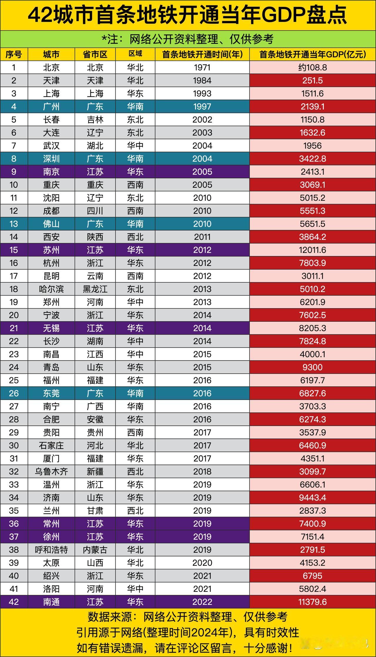 42城市首条地铁开通当年GDP盘点,广东四城在列,江苏6城上榜