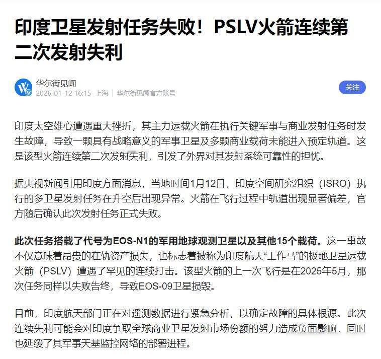 火箭炸了,文凭假了,空气毒了——印度2026开年三连崩 1月12号那天,印度的PSLV-C62火箭飞到天上346秒,突然自己乱转,最后带着16颗卫星一起掉下来,这不是第一次出这种问题,去年5月就发生过一样的情况,第三级发动机点火不稳的问题早就有人提出过,可是没人真正去改,他们就是急着赶进度,觉得能上天就行,结果又搞砸了,那颗叫EOS-N1的卫星是军用侦察的主力,现在没了,军队和农业部门都得等半年到一年才能补上,国际客户也开始跑路,怕下次再炸。 印度航天组织ISRO没有解释具体原因,只说飞行路线偏离后无法纠正,这种说法听起来像是在推卸责任,大家都知道问题根源在于测试时间被压缩、设计缺乏弹性、管理不够有序,ISRO不是技术能力不足,而是不愿意放慢速度打好基础,在航天这种风险极高的领域里,指望碰运气的操作方式早晚会引发事故。 另一边,教育圈也出了事,喀拉拉邦警察在年初查获一个造假窝点,他们找到十多万份假文凭,这些假证被卖到欧美和阿联酋等地,本科卖五万卢比,硕士卖十万卢比,更夸张的是,有些培训机构根本没有资质,却敢挂着官方牌子,还声称“三天就能拿到证书”,澳大利亚去年查出两万三千名持有印度假文凭的学生,今年他们加强审核,要检查课程内容、成绩单和学习记录,一项都不能少,结果印度高校在海外的名声变差了,企业招人时也得花更多时间去核对简历。 新德里的空气问题一直让人发愁,从去年十一月开始,空气质量就没有一天合格过,PM2.5最高的时候超过世界卫生组织标准的三十五倍,车辆太多、农民烧秸秆、工厂排放废气,再加上天气不好,污染物都堆在一起,政府虽然发布了不少文件,像是清洁空气计划和管理委员会,听起来挺有架势,但地方上没人认真执行,充电桩不够、补贴不到位,电动车也推广不起来,老百姓只能自己买空气净化器,在商场门口排队两小时,就为了抢一台机器,这不是生活,是大家自己想办法活下去。 这三件事看着没什么关系,其实都出在同一个问题上,航天部门明知设备有隐患还坚持发射,靠的不是科学判断而是自我安慰,教育系统的认证制度成了摆设,假文凭可以随便买卖,真本事反而没人重视,环境治理的政策写得漂亮,执行起来却不见动静,说到底都是为了追求速度、做表面文章,把该做的基础工作都给丢了。 我以前觉得印度发展得挺快,现在看很多地方只是表面热闹,火箭能上天不代表技术过硬,文凭发得多不代表人才合格,政策出台多不代表能落实到位,2026年刚开头这几件事就像三面镜子,照出背后的问题,不是运气不好,是系统本身在漏油,没人愿意停下来修理,就只能看着它慢慢散架,你可以说这是意外,但我更相信这是早晚的事。