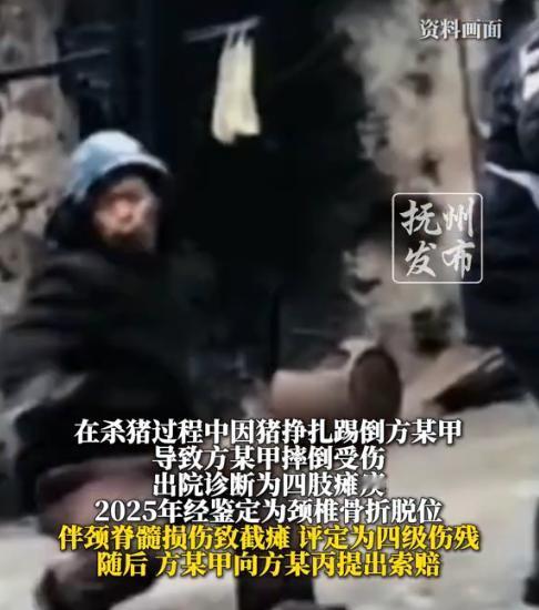 “冤不冤!”近日,四川合江,一老人应邻居要求帮忙杀年猪,没想到在按猪的过程中,猪挣扎的厉害,一脚踢在老人腰处,老人顿时倒地不起,送医后被确诊四肢瘫痪,双方最终因赔偿问题闹上法庭,网友:好心帮忙竟落终身残疾! 在农村,多地都有过年杀年猪的习俗,请邻里帮忙搭把手是再平常不过的事,可四川这位六旬大爷,却因一次帮忙按猪的举动,彻底改变了人生轨迹,让人既心疼又唏嘘。 据媒体1月14日报道,66岁的方大爷平时是个热心肠,邻居有什么事找他,他都会尽力帮忙。临近春节,家家都开始忙起来。这天邻居家准备杀年猪,想着自己家几个人按不住,于是便邀请方大爷来帮忙,方大爷二话不说就答应了。 杀猪当天,院子里众人合力把肥猪往案板上按,方大爷蹲在侧边死死按住猪腿,就在屠夫准备动刀时,年猪突然发狂扭动,后腿狠狠踹了一脚。方大爷一下没来得及反应,当场被掀翻在地,瘫在地上直喊疼。 众人赶忙将他送医,检查结果竟显示其脊柱爆裂性骨折、神经严重受损,最终确诊四肢瘫痪,鉴定为四级伤残。后来邻居来看过方大爷,但双方因赔偿问题没有达成一致,无奈之下方大爷便将对方告上法庭。 法院审理认为,方某丙作为邀约人,未为危险的杀猪活动提供安全防护,存在主要过错,判决其承担70%责任,赔偿方某甲52万元。 网友看后纷纷感慨,方大爷好心帮忙却落得终身瘫痪的下场,实在太冤了;也有人表示,谁能想到年年过年都杀年猪,能出这种事儿。 信息来源:《1月14日发布“杀猪热”敲响安全警钟!帮杀年猪致瘫痪 52万赔偿引热议社会热点杀猪宴 过年 新年