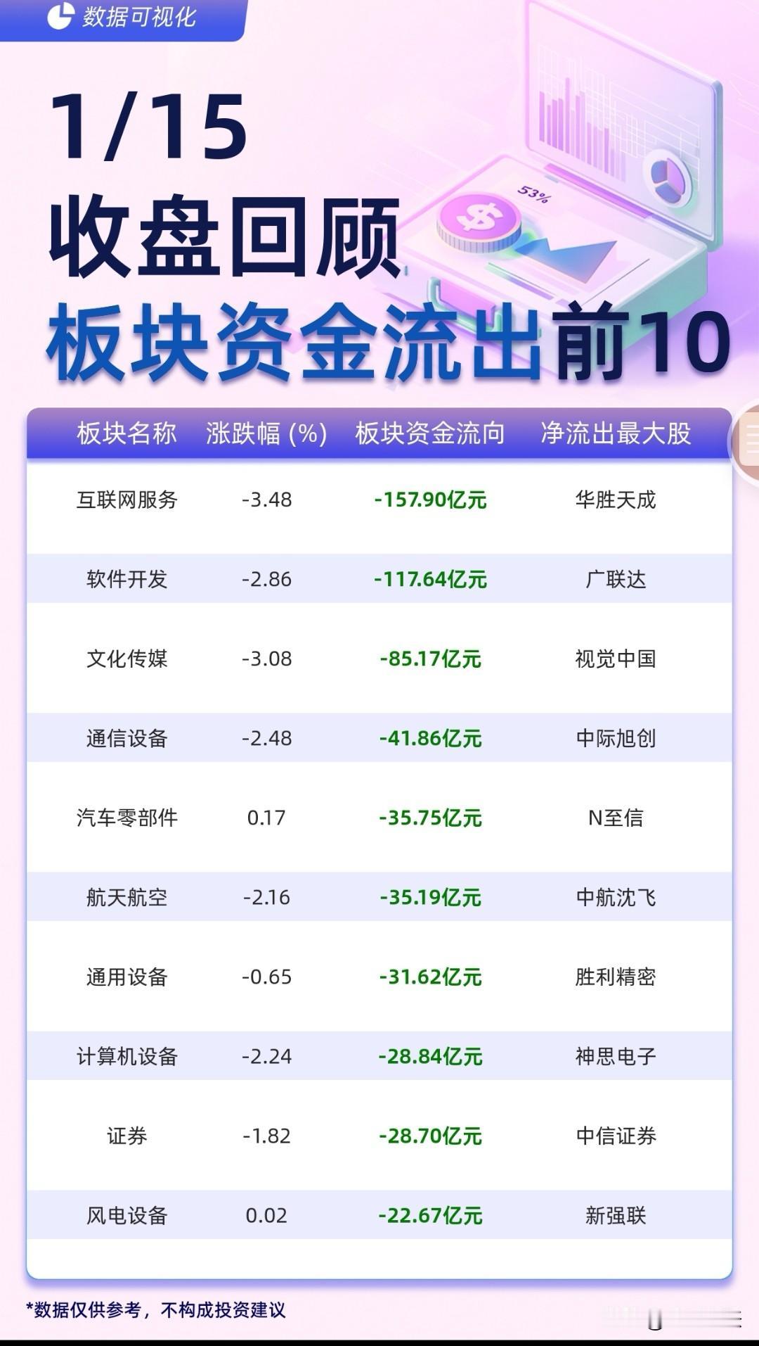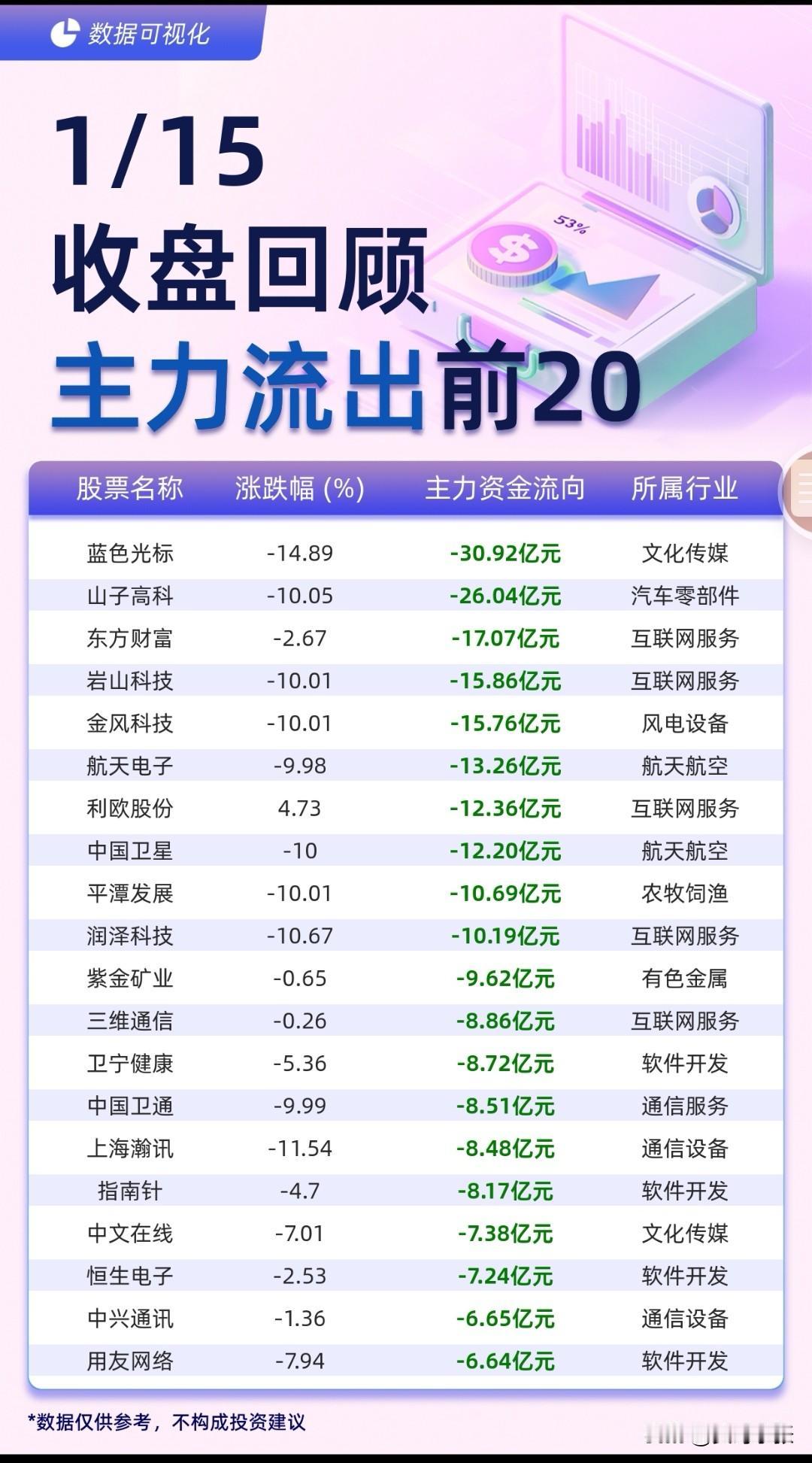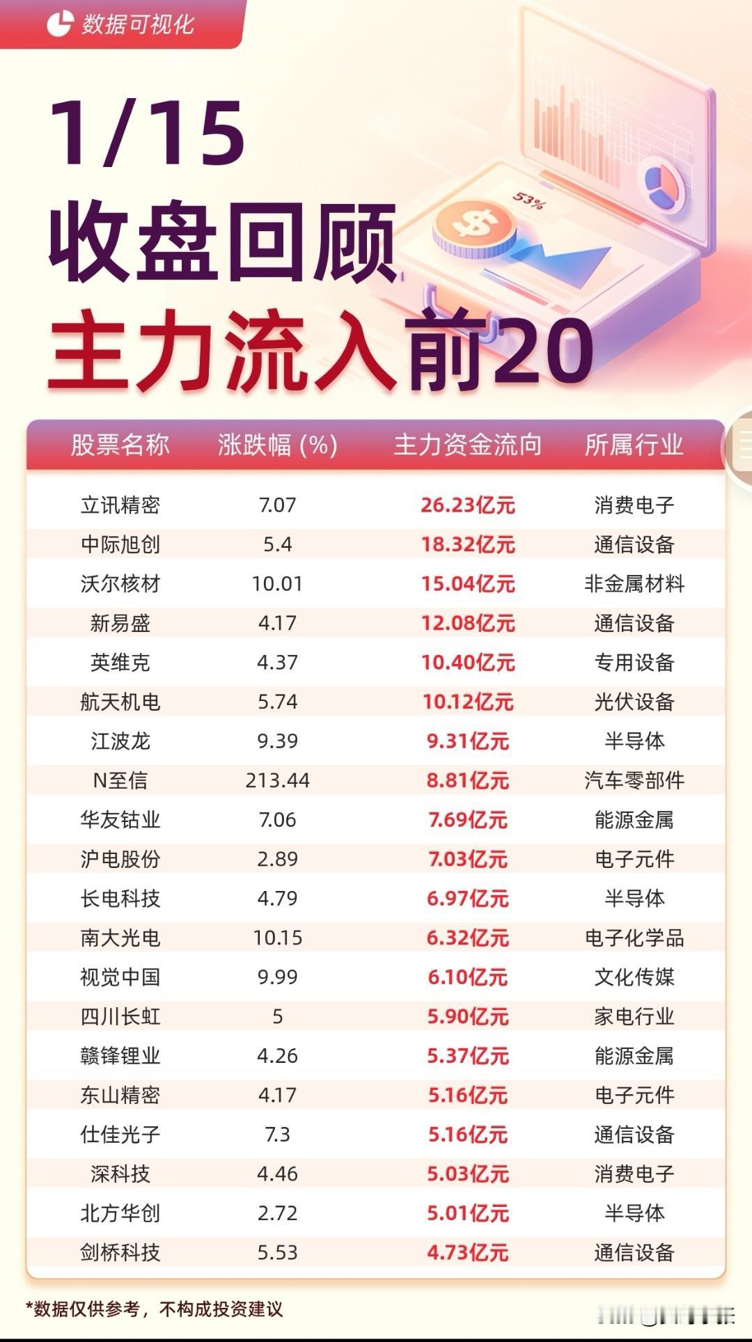 1月15日收盘数据新鲜出炉!主力资金动向呈现鲜明分化,个股层面,立讯精密以26.23亿元主力流入居首,蓝色光标则遭30.92亿元主力资金出逃;板块维度,半导体板块吸金49.25亿元领跑流入榜,互联网服务板块净流出157.90亿元成资金撤离重灾区。市场冷热不均的格局下,各赛道的资金博弈尽显,投资布局需更注重细分领域的动向差异。