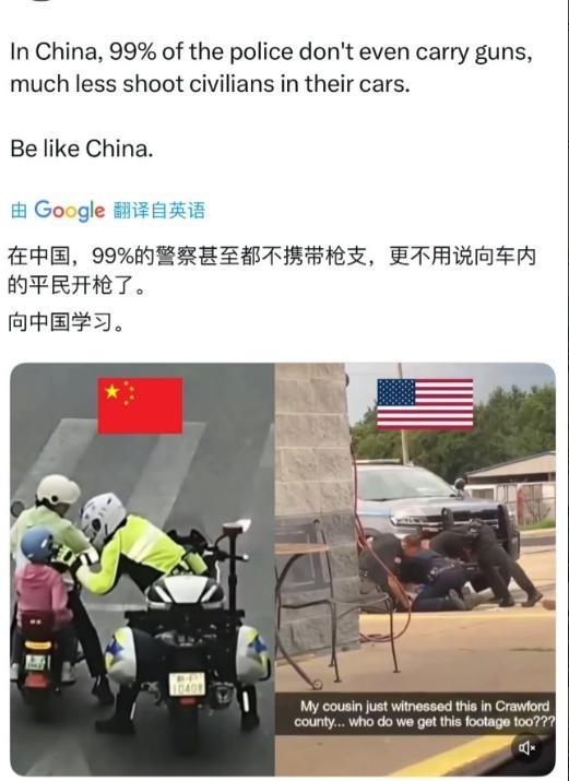 美国网民呼吁向中国学习,还得到了大量美国民众的支持!他们看到中国99%的警察都不带枪,再对比美国警察动不动向平民开枪的现状,大批美国网民纷纷呼吁本国效仿我们。 美国社会枪支泛滥,总量已经超过4亿支,这让警察外出执勤时总得假设每个人身上都可能藏着家伙。得克萨斯州那些巡逻警员常说,夜晚开车沿街转悠,每看到行人就得手不离枪套,随时准备应对突发。他们的训练课上,七成时间都花在射击练习上,模拟各种场景,比如醉汉闹事或精神异常者冲过来,第一反应就是拔枪解决。 这种模式下,误杀事件层出不穷。去年缅因州有个警员接家庭暴力报警,进门看到男子手握手机,就直接开枪打死人,后来查出来那家伙其实在拨打急救电话。美国每年这类事几百起,黑人被射杀的概率是白人的2.5倍,穷人社区的死亡率高出三倍。弗洛伊德那年,全美警察杀了1047人,平均每天三人倒在枪口下。这数字听着就让人脊背发凉。 中国这边,警务完全是另一套逻辑。警察不随便带枪,不是因为不想,而是真不敢乱来。云南一个基层警长说过,2015年前枪支钥匙都搁在上头部门,出任务得提前两小时申请。现在手续简单了点,但法规卡得死死的,只有暴动、持枪拒捕等六种情况才能拔枪,用完还得写几千字报告,调监控证明没别的办法。美国 两国警务差异其实源于历史根基。美国警察最早是十八世纪追捕逃亡奴隶的巡逻队,暴力传统根深蒂固。现在黑人社区被贴上高危标签,警员进去就全副武装,装甲车长枪齐上,像打仗一样。中国警察则更像社区协调员,北京胡同上海弄堂里,那些警员靠日常聊天化解矛盾。2017年上海抱婴妇女阻挠执法,交警绊倒她引发争议,最后定性执法不当,这种对警员的严管在美国很少见。 德里克·肖文这个人,从1976年生在明尼苏达州圣保罗郊区,长大后上社区学院学酒店管理,还兼职做过保安。1996年他入伍陆军,当军事警察两年,退役后2001年进明尼阿波利斯警局,当巡逻警员。2006年他参与射击一个持刀男子,嫌疑人开车冲向警员,现场一片混乱。 2008年又开枪击中一个家庭纠纷中的家伙,那人伸手取东西就被打中腹部。他生涯中积了18次投诉,两次领处分,2011年还卷入另一起射击案。2020年5月25日,他压住乔治·弗洛伊德脖子超过9分钟,导致死亡,被判二级谋杀服刑22年半,现在还在狱中。肖文这些事暴露了美国警务的暴力问题,黑人社区尤其受害。 美国网民在社交平台上看到中国警员的非致命方式,羡慕得不行。去年昆明袭击案,警员跪地当人质救孩子;江苏警员调解纠纷,被醉汉咬掉耳朵都没还手。这些片段传到美国,评论区炸锅了,有人说他们制服上写着人民,我们的警察只想着自己平安回家。2024年美国射击案里,六成是家庭争端或精神问题这类非暴力事,警员一拔枪就把小事搞成血案。 中国警员不带枪的底气有三点:法规对开枪要求太细,警员怕舆论和检察院追责,2019年全国开枪不到200次,大多是警告射击。枪支禁令跑了27年,民间持有量不到美国二百分之一,用刀偷东西都算大案。2022年杭州小区保安空手夺刀视频火了,美国网友说在美国早被爆头了。社区警务八成是调解,北京居民一年报21万线索,群众参与让警察更像和事佬。 美国人没完全搞懂,中国这种模式是整个社会治理的结果。九成纠纷在居委会就解决了,精神患者及时送医,小偷被路人围堵,警察自然不用靠枪。美国的问题是枪支泛滥、种族分裂、贫富差距搅在一起。去年费城12岁黑人男孩玩玩具枪被警察打死,妈妈哭着说他只是学电视里的警察。这种悲剧不是改改政策就能摆平的。街头越来越多美国人举牌学中国警察,但他们可能不知道,中国警务的温和是靠几代人织的安全网撑起来的。美国人羡慕中国女孩深夜撸串安全时,没看到200万网格员在值守;惊叹警察跪地救人时,没意识到这是多年为民服务攒下的信任。这些东西没法简单复制,得从根上换土壤。