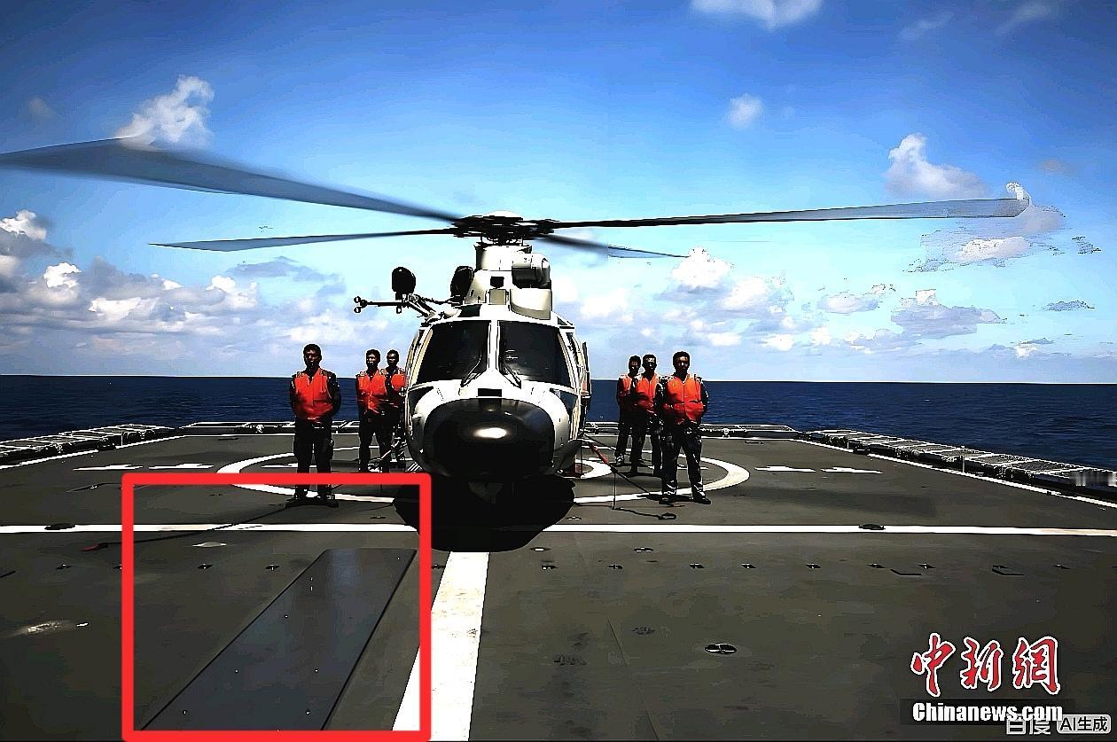 052D的直升机甲板上,也有一个用于弹药和设备运输的升降机,位置就在机库门的左前方。直升机挂载的武器弹药没有保存在机库中,和飞机的维护设备放在一起。而是保存在直升机甲板下专门的武器中,这样布局可以增强安全性。当无人机上舰后,这个升降机也可以提升无人机挂载的各种小型弹药。