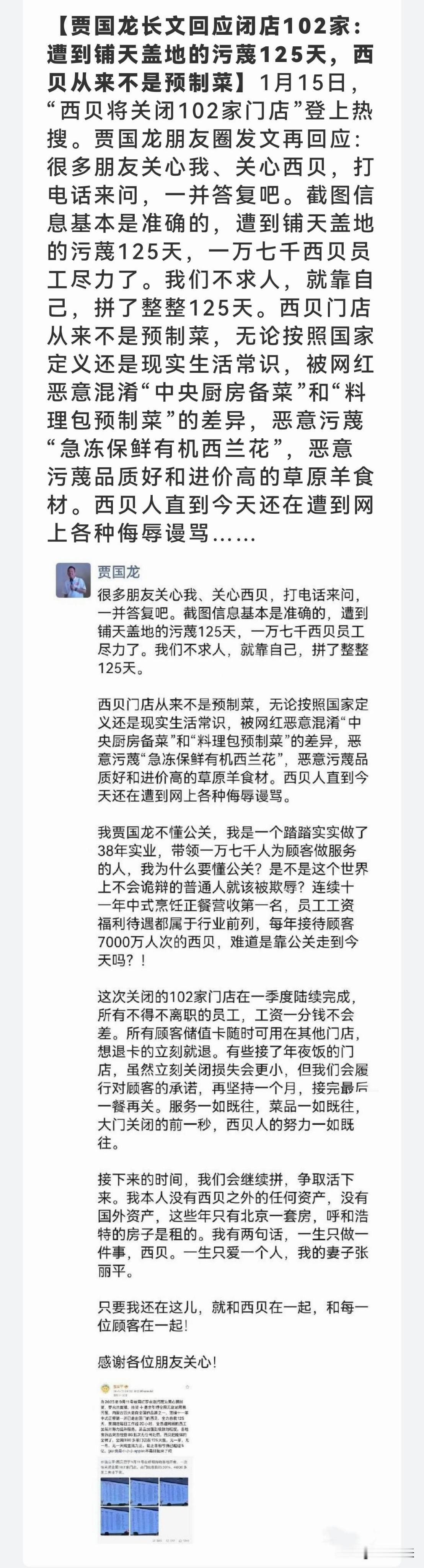 1月15日,西贝将关闭102家门店的消息登上热搜,创始人贾国龙发长文回应此事。他直言西贝遭125天的网络污蔑,强调门店从不用预制菜,只是被恶意混淆了中央厨房备菜与料理包预制菜的概念。对于闭店,贾国龙表示会妥善安置离职员工、兑现顾客储值卡承诺,甚至为接年夜饭的门店坚持营业一个月。此外,他还坦言自己深耕实业38年,无多余资产,会与西贝共进退。你们怎么看?