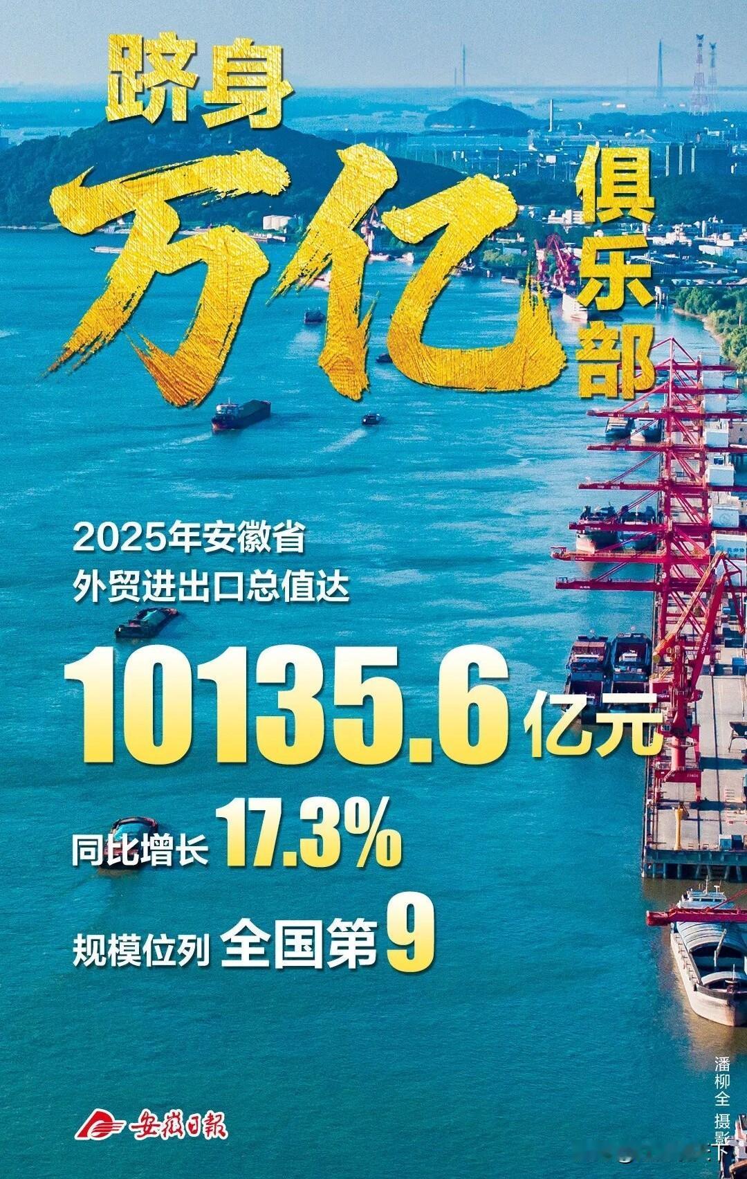 安徽省太不容易了,成为中部地区首个外贸万亿省份 如果把时间倒回到20年前,说安徽省工业发展很好,外贸业跻身全国十强,成为工业大省,估计不用外省人质疑,我们安徽人都会反问,安徽可能吗?安徽除了种地有什么工业? 时间来到了2026年,安徽官方对外宣布,2025年,安徽外贸进出口总值突破万亿,达到10135.6亿元,同比增长17.3%,位居全国第9名,也是中部六省,首个外贸破万亿的省份。 2025年安徽省工业营收位居全国第5名,外贸业位居全国第9名,安徽已经从工业大省向工业强省发展。 全国外贸破万亿的省市总共9个,分别是广东、江苏、浙江、上海、北京、山东、福建、四川,安徽。 安徽经济排名 安徽GDP 安徽县域gdp 安徽经济实力 安徽经济开门红 安徽外贸出口 安徽外贸公司