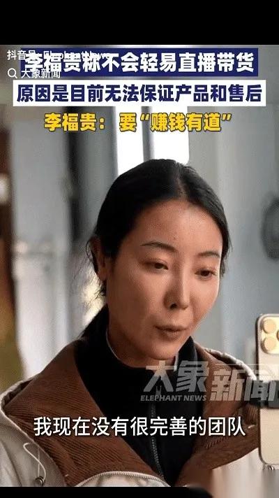 李福贵当着所有镜头的面,直接给直播带货这碗饭,泼了一盆冷水。 记者问她,现在这么火,为什么不趁热带货? 她手一摊,话说得特实在:“我没有完善的团队,做不到品控和售后,我就不赚这个钱。” 这话一出来,不知道多少正在直播间里声嘶力竭、假装跟品牌方砍价的主播,脸上一阵发烫。 湖北的朋友表示:不赚钱!是这个社会的病语!我也是看到这篇文章,才知道李富贵这个人,也不了解她,但是,在这个现实的社会,她不是你妈!凭什么不吃不喝的来帮你?好,就算她愿意饿死,但是她的团队都想饿死吗?明码标价,每斤加个一两块钱不是正常吗?黑她的,基本上都是眼红的又做得不如她的同行! 有没有团队不重要,只要东西好,价格方面自己能接受就买,接受不了可以不卖,最痛恨的是卖假货的,和卖垃圾产品的。 赚不赚钱我是不知道,但是她那心地善良淳朴的一面,不是装的,你看那些大山里的爷爷奶奶们像是装出来的吗?我个人认为她能够坚持为老人们做善事就应该鼓励和支持,但是人家带货赚米也是天经地义,至于为什么能卖的好,一下子卖那么多,是因为大家都觉得她善,认可她这个人,同样的道理,就算是线下生意,你想做的好,不是因为你的客户认可吗?那客户认可你的人照顾你的生意,难道就不能赚米了吗?为什么没人照顾你的生意,因为你没办法感动别人,当然如果她利用大家对她的信任,以次充好,那也就是一次生意。 有人说她写真不赚钱 不知道有啥可喷的 我在街上买的一桶5斤的还35块钱呢合7块钱一斤 有时候还8块钱一斤 她赚个屁呀。 太行山小米基本都是山地,面积小种植麻烦,而且还灌溉不到,我们本地买的山地小米一般是8-10元,李富贵卖的价格不贵。 价格我认为一点都不贵,超市里有7块钱1斤的,有4块钱1斤的,有3块钱1斤的,我就买7块钱1斤的,因为熬出来的粥是不同的。 网友表示:这价格正常,反正在山西就这样,普遍六七块钱一斤,加上快递费,挣钱也正常,有钱才能去助农,没钱寸步难行,支持福贵! 说李子柒的不应该呀,拍的视频很有质感,她去学非遗文化也是给自己涨知识,人都是活到老学到老。