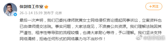 保剑锋起诉黄慧颐黄慧颐说保剑锋婚前出轨前女友黄慧颐发文指控保剑锋,而保剑锋工作室已宣布就此事向黄慧颐提起民事诉讼,相关立案资料已提交法院。其工作室称将通过法律程序澄清事实。目前,事件具体情况有待进一步关注。