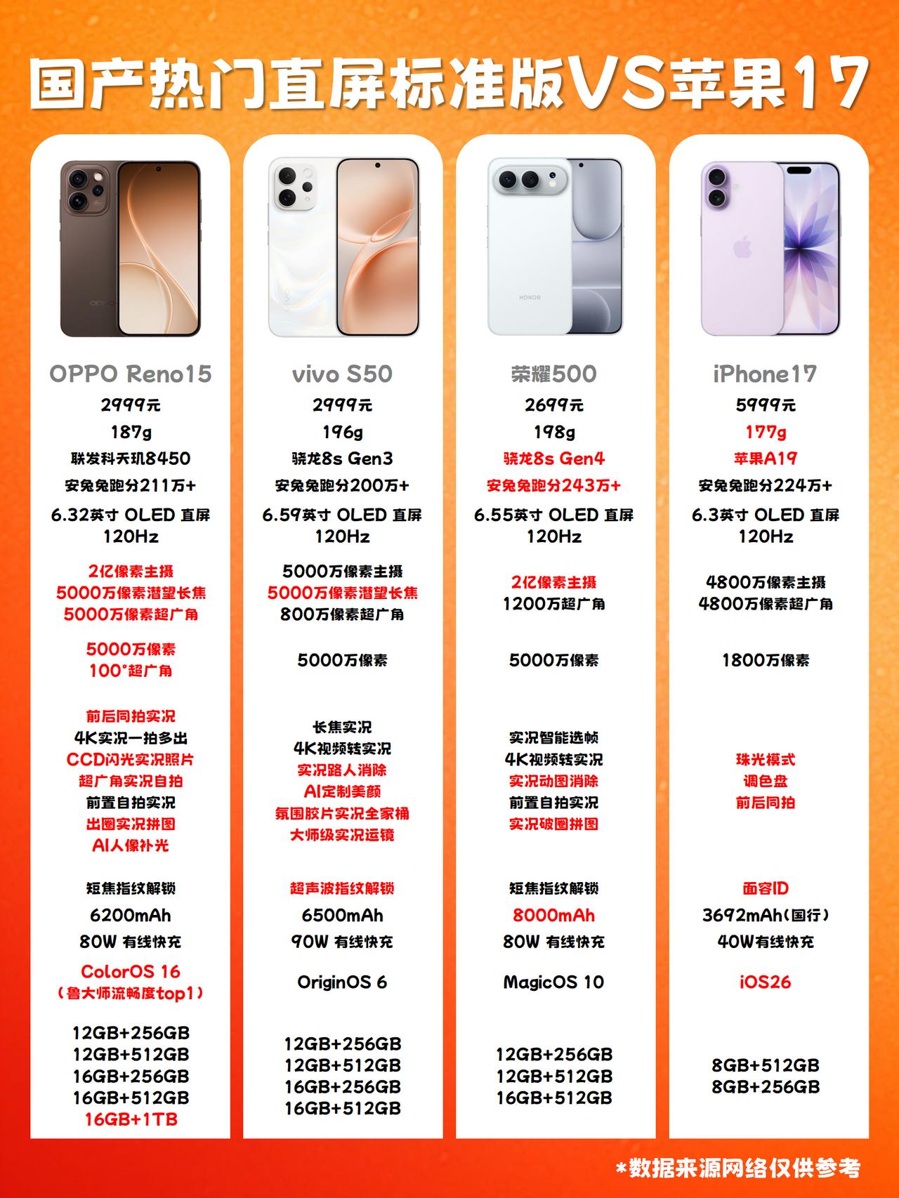 天亮了!直屏机不是只能选苹果17 iPhone 17是很火,看好多人都买了,但5k多的价格感觉还是超了不少人的预算,年前打算换手机的,其实国产就有很多不错的直屏机可选。 -- 最近的新品就很不错嘛,像OPPO Reno15、vivo S50和荣耀500这几款,国补后2000多体验就很不错了~ -- 荣耀500是6.55英寸直屏,比苹果17大一点,8000mAh电池续航很不错,拍照也有2亿+1200万双摄,各方面体验都不错的,开售到现在全系销量70+w,入手不怕踩坑。 -- vivo S50尺寸跟荣耀差不多,6.59英寸直屏,有超声波指纹解锁更方便,后置5000万主摄+5000万潜望长焦+800万超广角,拍照很不错,支持超声波指纹,全系销量约40+w,人气也很高。 -- OPPO Reno15比较小巧精悍,6.32英寸直屏,手感和iPhone17类似。 而且它虽然尺寸小但配置却很顶,镜头不像上面两款有凑数的。 2亿主摄、5000万潜望、5000万超广角都有,前摄都是5000万100°超广角的,拍照体验会更好,而且还有CCD闪光实况、出圈实况拼图这些live图玩法,拍照体验我觉得应该是这几款里👄好的,目前全系销量90+w,妥妥的爆款。 -- 这几款都很值得入手,主要是看大家的喜好来选,。 😎我是更喜欢Reno15一些,毕竟影像配置确实强,ColorOS 16体验也更好一些,还能跟苹果互联互通,日常用更便利一些。 要你选的话,你会更倾向哪款呢?