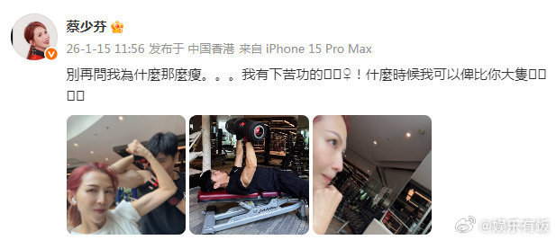 蔡少芬张晋比肌肉 蔡少芬晒出和张晋的比肌肉合照,回应大家关于她瘦的疑问:“別再問我為什麼那麼瘦。。。我有下苦功的!什麼時候我可以俾比你大隻”。夫妻俩一起健身的样子真的好甜,嗑到了,实名羡慕这种关系!