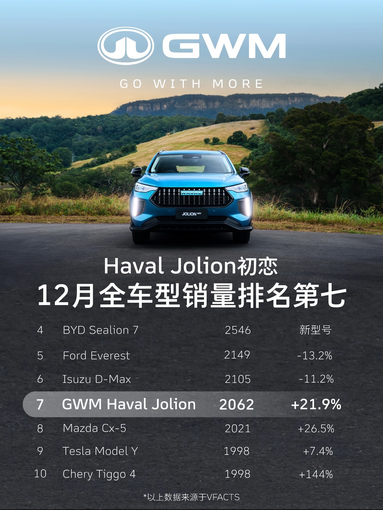 2025年长城汽车在澳洲市场共销售52809台新车,同比增长23.4%,位列市场第七。同时哈弗Jolion也在12月来到了全车型榜第七,共销售了2062台,同比增长21.9%。2026年新年伊始坦克300Hi4-T、山海炮3.0T柴油版等即将登陆澳洲市场,将会为长城汽车注入新的活力我与汽车的日常汽车资讯汽车杂谈