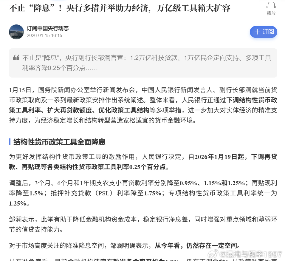 不止“降息”!央行多措并举助力经济,万亿级工具箱大扩容盘后,央妈降息了,大家开心了~~为更好发挥结构性货币政策工具的激励作用,人民银行决定,自2026年1月19日起,下调再贷款、再贴现等各类结构性货币政策工具利率0.25个百分点。调整后,3个月、6个月和1年期支农支小再贷款利率分别降至0.95%、1.15%和1.25%;再贴现利率降至1.5%;抵押补充贷款(PSL)利率降至1.75%;专项结构性货币政策工具利率统一为1.25%。