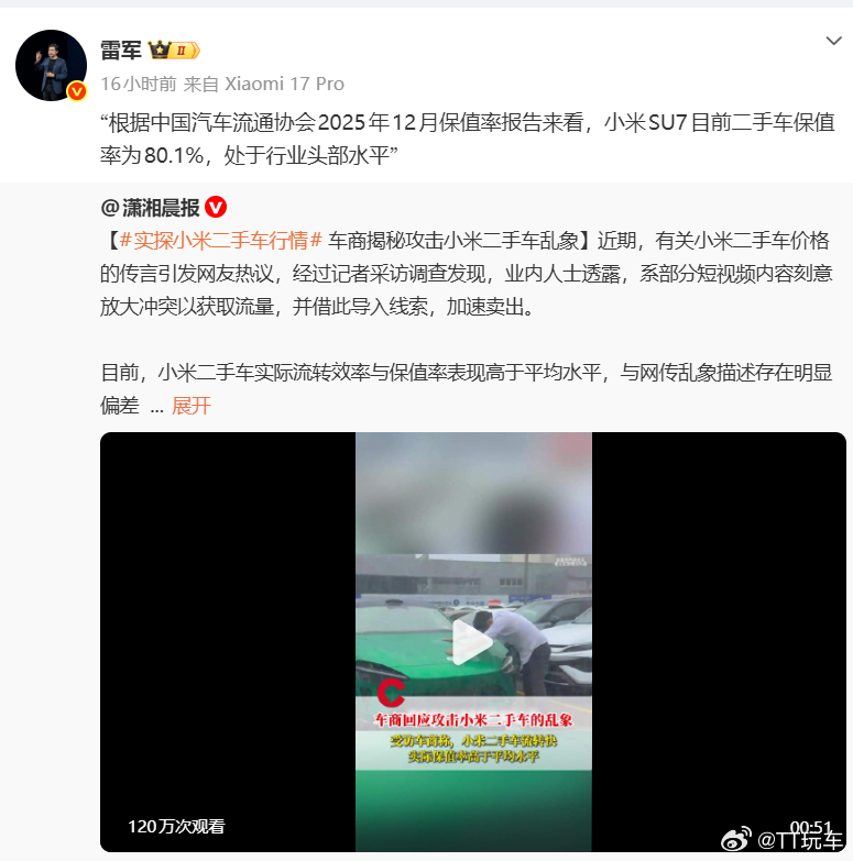 雷军又上热搜了!声称小米二手车保值率超80%,保持行业领先!忍不住想笑,这指
