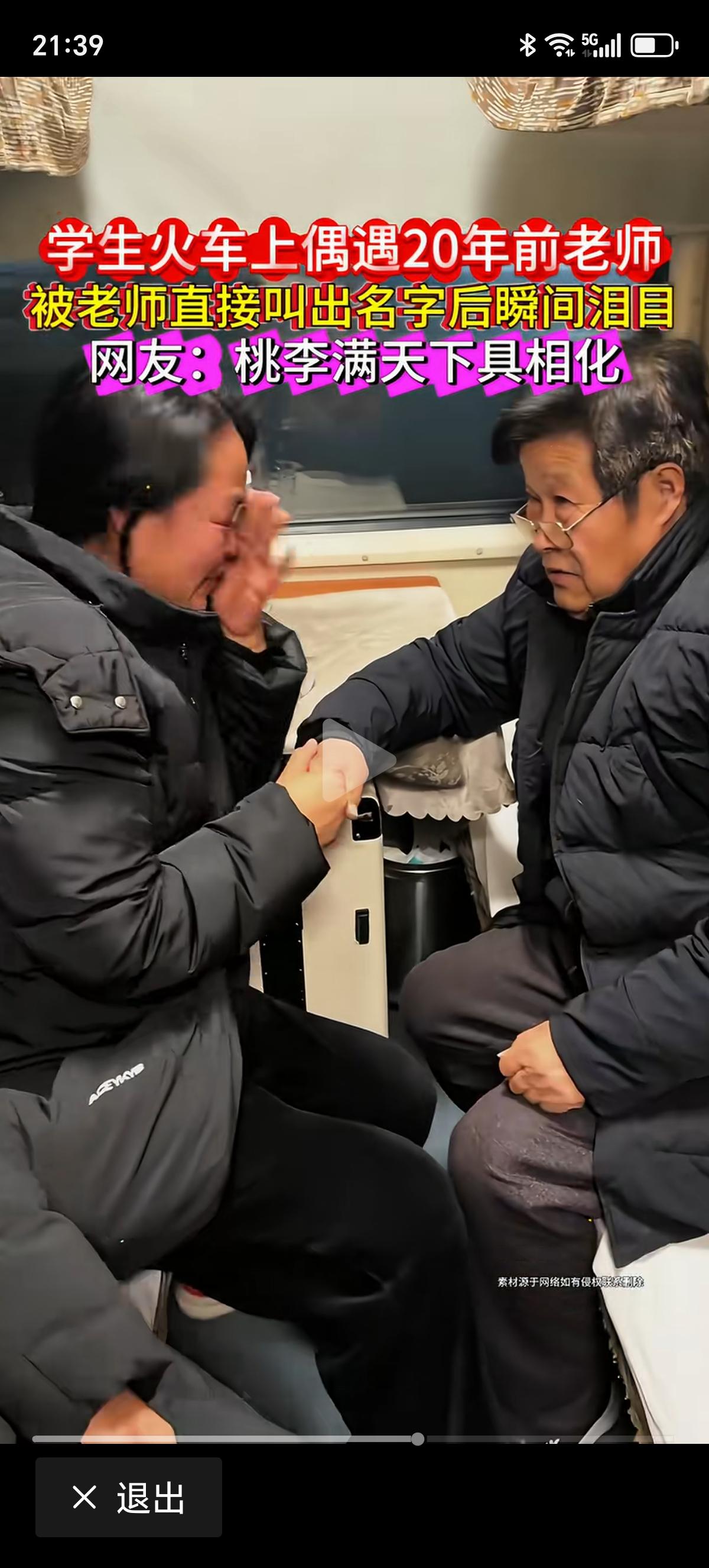 好感人的一幕,瞬间泪奔了! 火车上隅遇20年前的老师,被老师直接叫出名字后,瞬间泪奔了! 确实非常感动!二十多年未见能叫出名字!可见你在老师的心中影响和地位!真的胜过他老人家自己的孩子!真是个有心的好老师! 网友: 这是老师的心腹,要不就是心腹大患,中等生多半记不住吧!还有网友称:不是学霸就是学渣,不然老师不会记得的,[大笑]