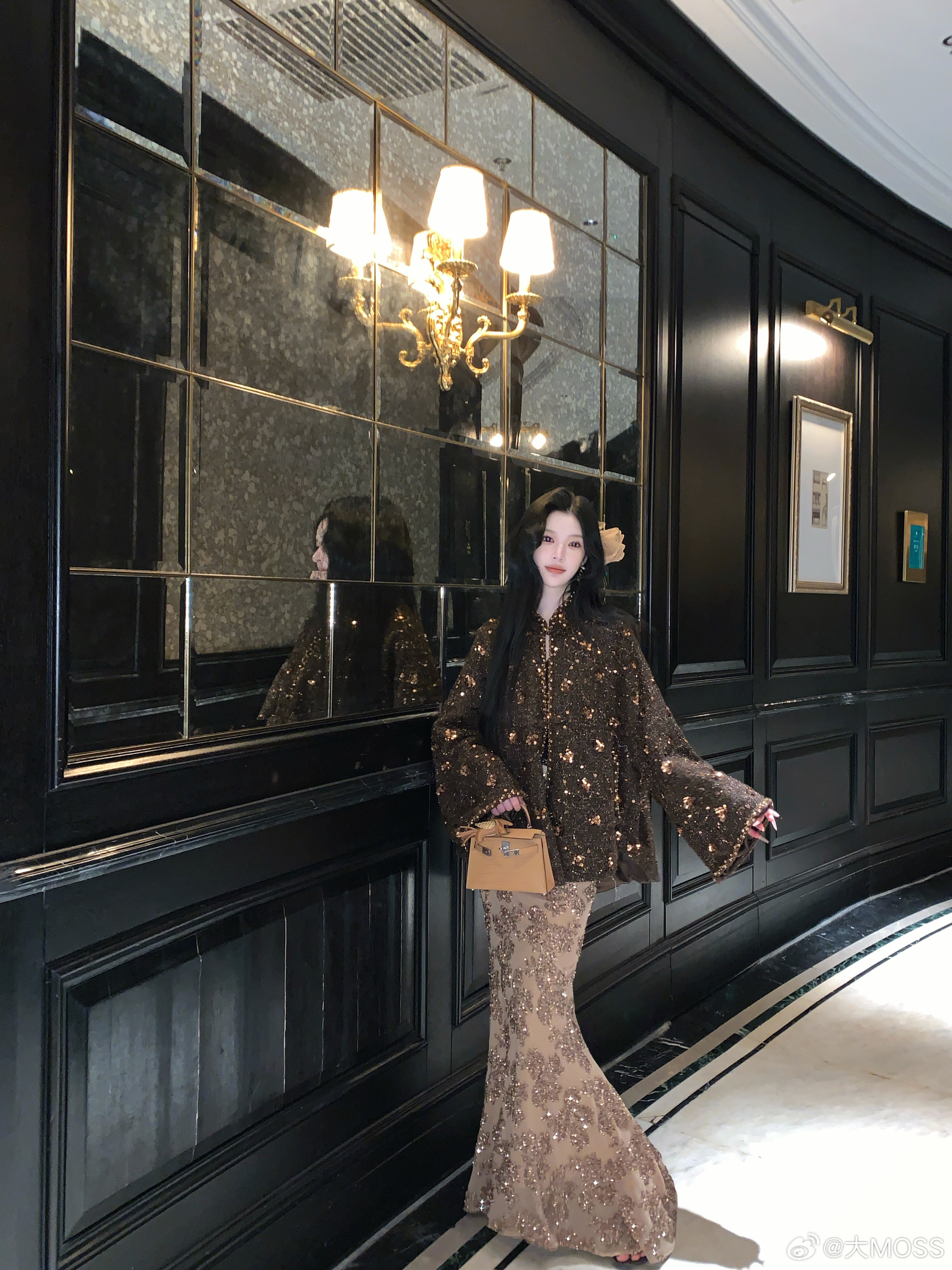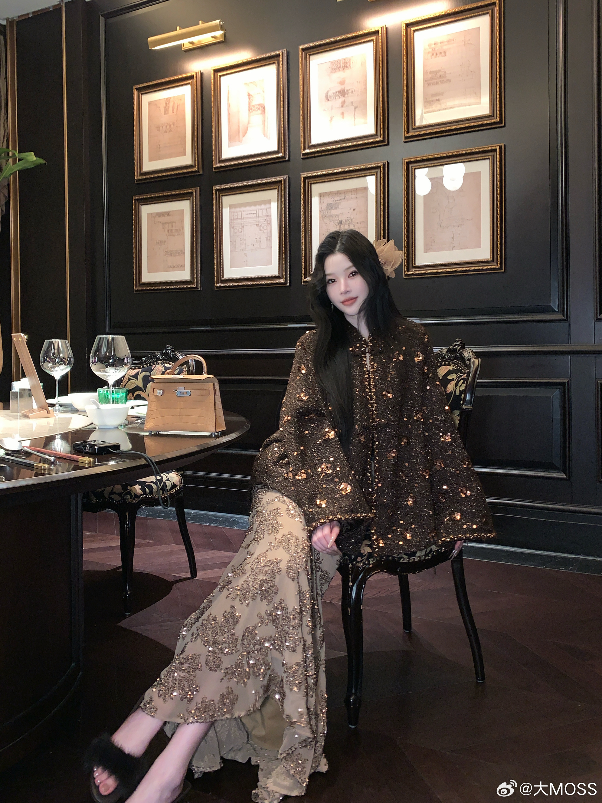 𝑴𝑶𝑺𝑺 𝟏.𝟏𝟓/𝟐𝟎:𝟎𝟎𝒑𝒎【浮光锦时】🤎🟤新中式重工珠绣小香风外套金棕色重工亮片小香风面料自带细碎鎏光✨亮片均匀缀满粗花呢肌理,小香风面料独特的风格给衣服带来了独特的气质。门襟点缀的织带以手缝工艺固定,钻饰与亮片呼应,手工制作的精致也增加了外套传统中式的手工的温度。外套采用宽松版型,衣身垂坠感极佳,剪裁自然舒展不紧绷,对不同肩型与身形都友好包容。新中式穿搭