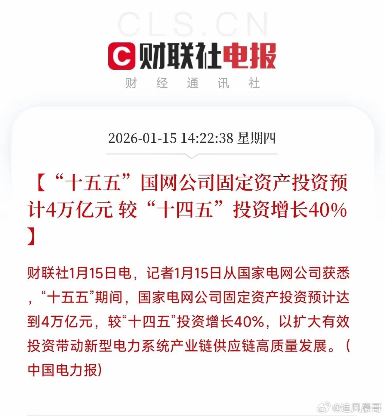 利好,大利好,又是大利好!“十五五”国网公司固定资产投资预计4万亿元较“十四五”投资增长40%。相当于每年投资8000亿,这是大利好,对于电网设备,基建,特高压,电力都是大利好。人工智能和算力的尽头就是电力,未来发展各行各业都将离不开电力,电力空缺巨大,机会也是巨大的,投资空间巨大,预期拉满。恭喜持相关概念板块的朋友们,明天又有大肉吃了!财联社1月15日电,记者1月15日从国家电网公司获悉,“十五五”期间,国家电网公司固定资产投资预计达到4万亿元,较“十四五”投资增长40%,以扩大有效投资带动新型电力系统产业链供应链高质量发展。4万亿投资驱动下,电网向绿色、智能、强韧升级,新能源并网、特高压、配网数智化与全产业链迎来黄金发展期。一、投资预期①投资规模:固定资产投资达4万亿元,创历史新高,带动产业链供应链高质量发展 。②能源转型:风光新能源装机年均新增约2亿千瓦;非化石能源消费占比25%、电能占终端用能比重35%;满足3500万台充电设施接入 。③电网能力:建成主配微协同新型电网平台;跨区跨省输电能力较“十四五”末增长超30%;强化“西电东送、北电南供”,支撑“沙戈荒”与西南水电外送 。④科技与产业:攻克关键核心技术,推动产业链供应链全面自主可控;建成能源电力原创技术策源地,形成领先产业集群 。二、发展空间1.新能源并网:年均2亿千瓦风光新增装机,配储与调节能力建设空间大,支撑高比例消纳 。2.特高压与主网:外送通道提速,特高压投资与技术迭代(如柔性直流)空间广,跨区优化配置能力显著提升 。3.配网与微网:城市、农村、边远地区配网升级,探索末端保供/离网型微网,提升供电可靠性与灵活性 。4.数智化转型:AI、大数据、数字孪生等深度应用,“人工智能+”专项推动电网运维与管理效能跃升 。5.产业链带动:投资拉动设备制造(特高压、储能、充电桩)、信息技术、电工装备等上下游,催生新质生产力与产业集群 。总之,4万亿投资驱动下,电网向绿色、智能、强韧升级,新能源并网、特高压、配网数智化与全产业链迎来黄金发展期。且未来发展各行各业都将离不开电力,电力空缺巨大,机会也是巨大的。