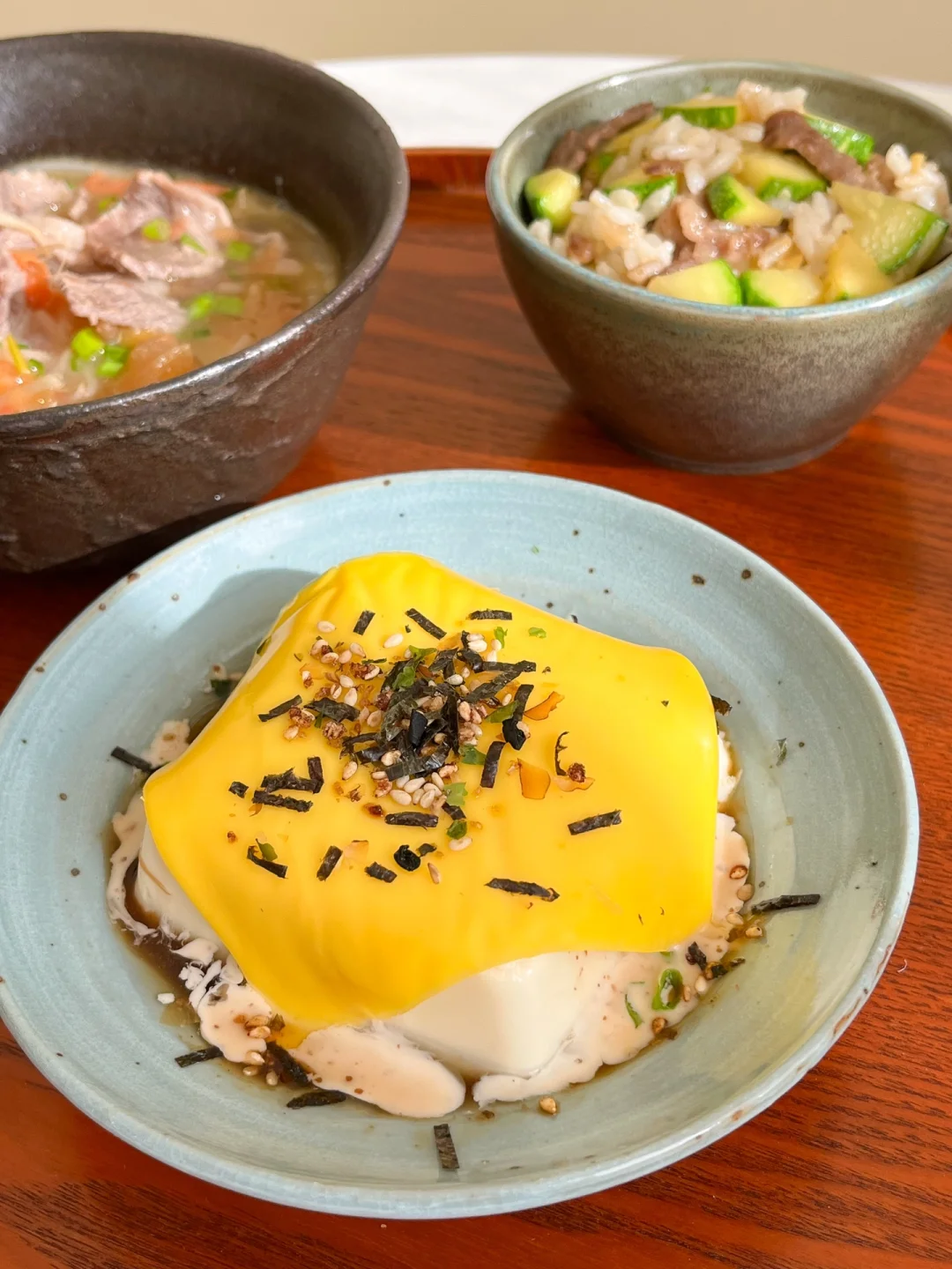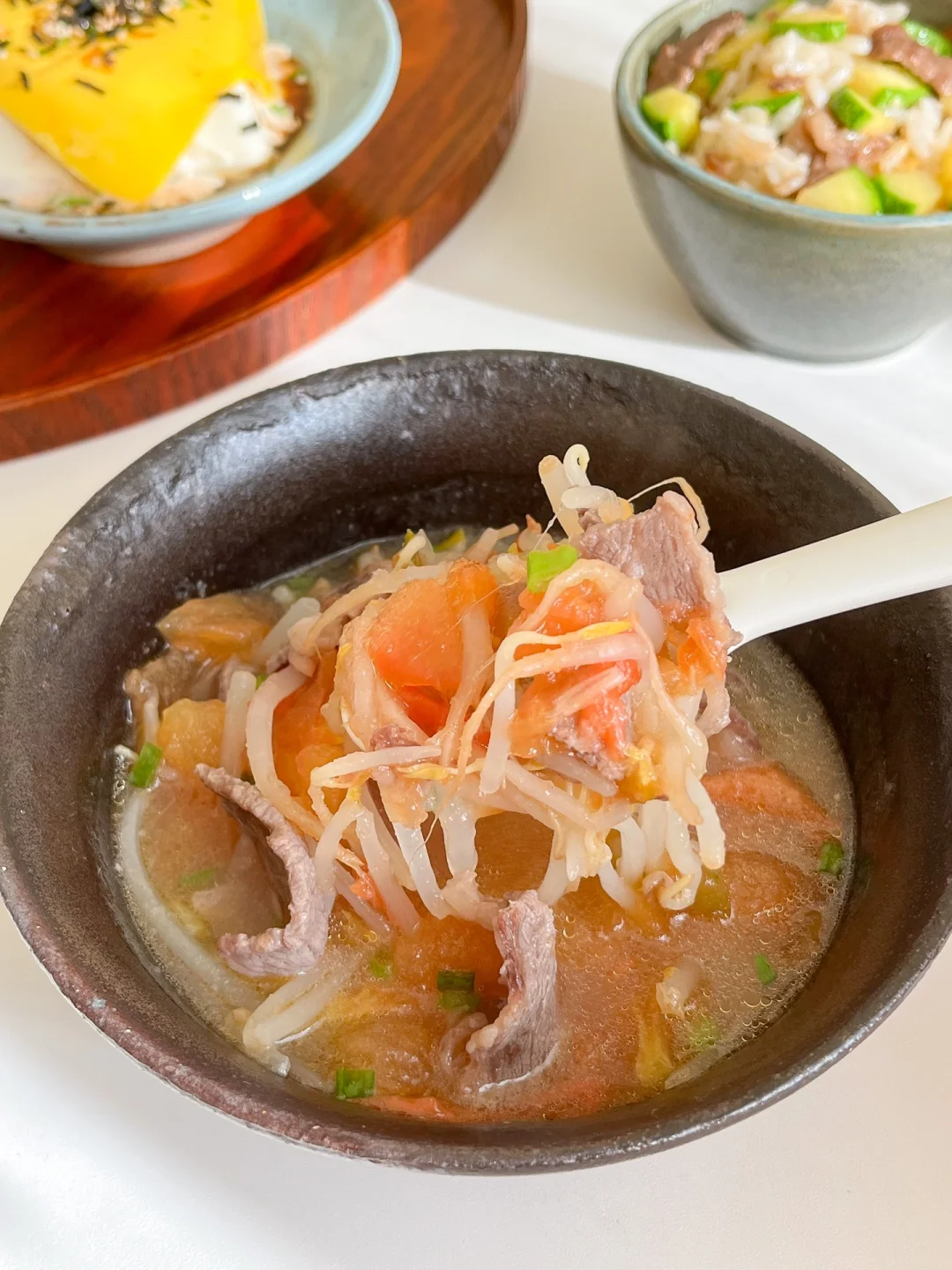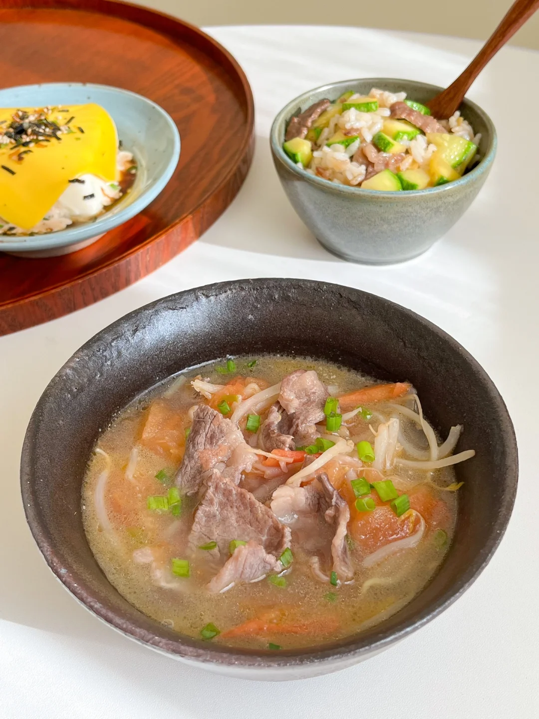 “半饱总比过饱好!一个人吃饭准备食材也要控制好量,宁少不多!” 今日午餐: ¹西葫芦牛肉炒饭 ²番茄豆芽牛肉汤 ³芝士豆腐 冬天就想吃点暖乎乎的食物 一碗热汤和一碗蔬菜炒饭就足够了 怕自己吃的多 可以准备点好看的小号碗盘 吃不完的食材用保鲜膜分装好 留着下顿再吃