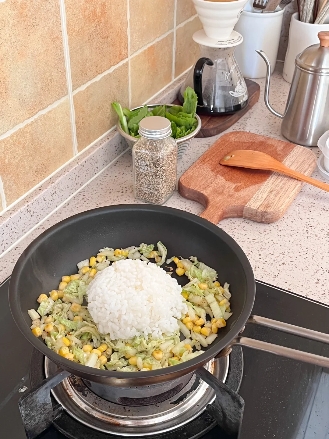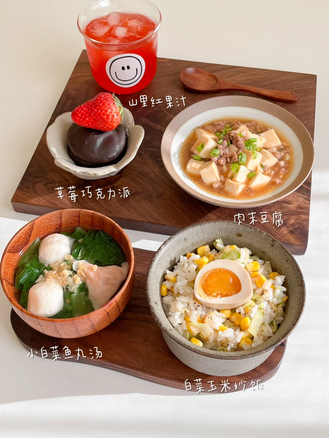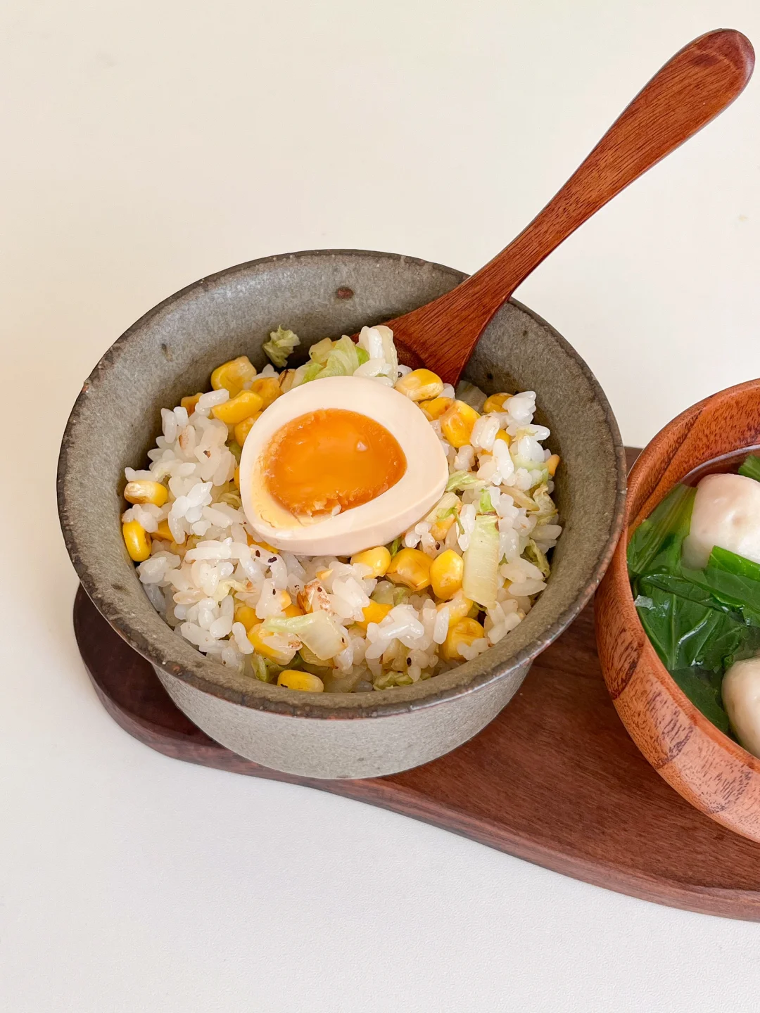 “下夜班的日子来不及买菜,冰箱里还有一颗秋天自己种的白菜,干巴得只剩下菜心了,切碎和玉米粒一起做炒饭,再简单的煮个小白菜鱼丸汤,十分就钟吃上了热呼呼的饭菜~” 今日早午餐: ¹白菜玉米炒饭 ²小白菜鱼丸汤 ³肉末豆腐 ⁴山里红汁