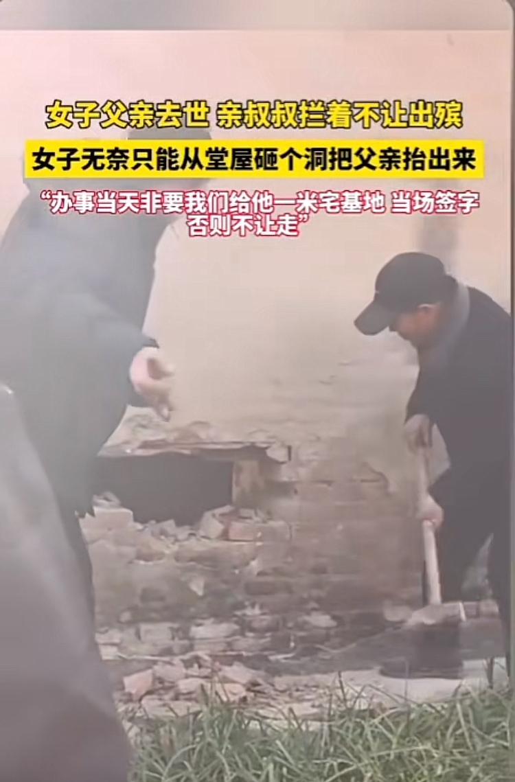 本是同根生,相煎何太急!一女子父亲去世,亲叔叔用宅基地要挟,拦着不让出殡,女子无奈从堂屋砸洞,将父亲从洞中抬出来。女子痛哭:我无能,让父亲受辱了。 父亲突发脑梗去世,女子在外地打工,急忙赶回老家操办丧事。没想到办事当天,女子的亲叔叔不帮忙,反而还拦着门口不让从他家门前路过出殡。除非当场签字答应划分一米的宅基地给他,否则免谈。 女子听后苦苦哀求:“叔叔,好事好商量,今天是我爹的正事,让我先办,宅基地这事事后我们再说行吗?” 不料亲叔叔一点情面都不给,反叫上两个儿子帮忙堵路,对一米的宅基地是势在必得,村委和邻居来劝,都没用。 女子实在没办法了,但不想父亲尸骨未寒,便家就不成家,宅基地是绝不能被叔叔分了去的。无奈之下,女子让邻居帮忙把堂屋砸出一个洞来,众人将父亲从洞中抬出去。 这位叔叔真是太没人性!亲哥刚去世,尸骨未寒,竟开始算计起侄女的宅基地,还以哥哥的丧事作为要挟,简直枉为人!退一万步讲,侄女是独生女,以后会出嫁,多年之后,这宅基地大概率会给到叔叔的儿子或者后代,为了这一米的宅基地闹成这样,真的寒了亲人的心。 叔叔这家日后肯定被指指点点了,他对亲人尚且这样算计,邻居谁敢跟他来往?好人家女儿谁敢嫁他家两个儿子?落得这样的下场也是自讨苦吃! 支持女子坚决不妥协,直接报警,让警察来维持秩序,为出殡开路,同时也录像留取证据,为以后宅基地所有权的纷争作准备。希望女子不要为此难过,这样的亲人不要也罢。