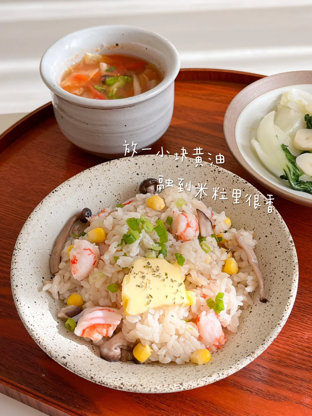 “最近很喜欢用土锅焖饭,简单的一锅米饭和蔬菜一锅出,出锅趁热再放上一小块黄油,真是喷喷香!”