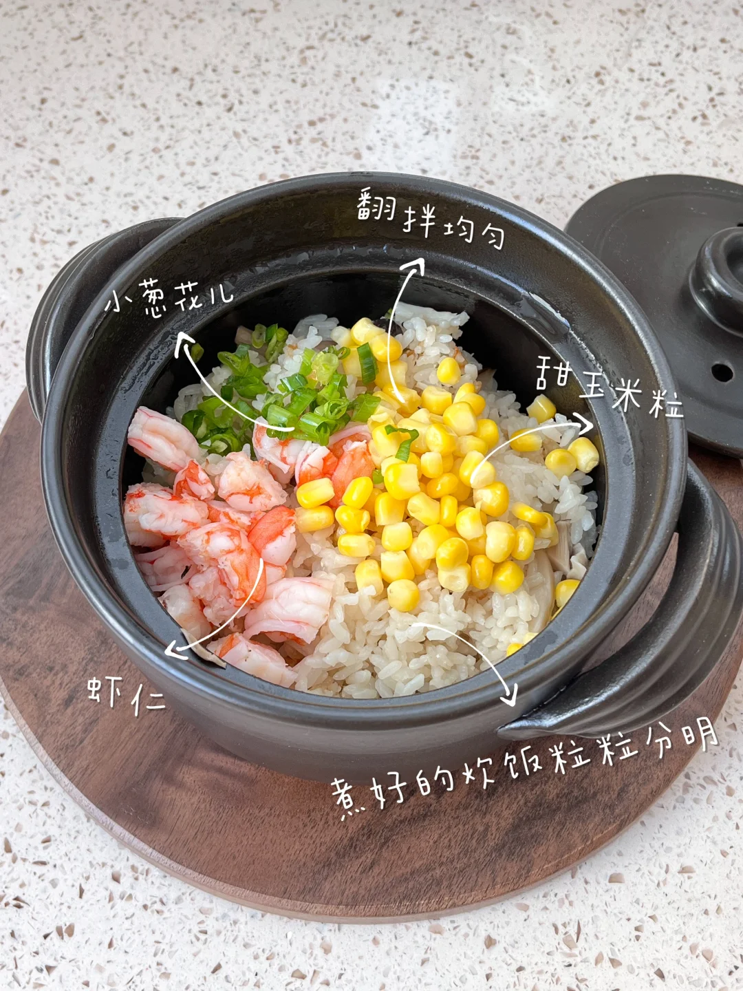 趁热加玉米粒和虾仁、葱花儿 拌一拌