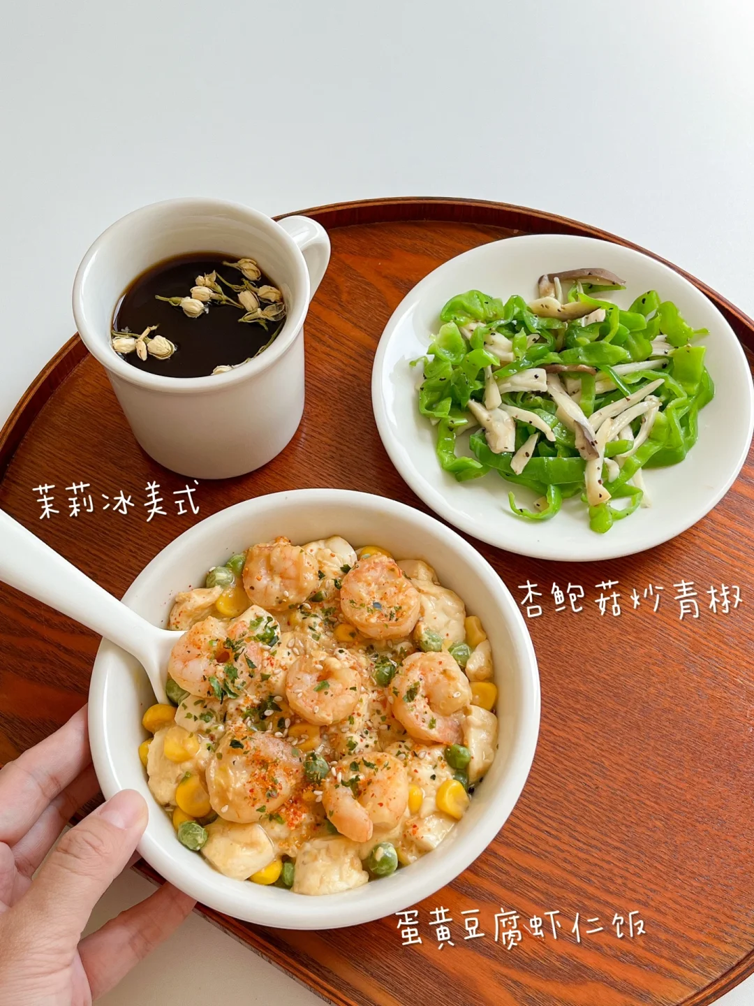 “一周可以选一天进行素食,排排身体多余垃圾。简单的素食也能做的很好吃!今天偷偷加了点虾仁,吃完身体很舒服~” 今日午餐: ¹咸蛋黄虾仁豆腐藜麦饭 ²杏鲍菇炒青椒 ³茉莉冰美式 🟠咸蛋黄虾仁豆腐藜麦饭 藜麦提前泡好,煮15分钟,一个人吃的话50克就够了。一颗咸蛋黄炒散放嫩豆腐和虾仁,两勺酱油调味,小火煮10分钟。豆腐带着咸蛋黄沙沙的口感,特别好吃! 🟢杏鲍菇炒青椒 家里最后一批自己种的青椒,皮很薄,稍微炒一下就熟了。海盐和黑胡椒碎,和杏鲍菇这种菌类很搭,撕成丝更好好入味。