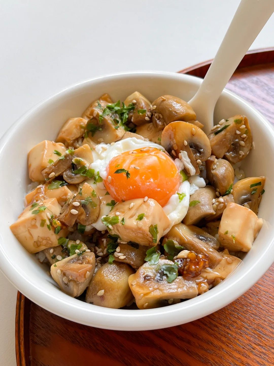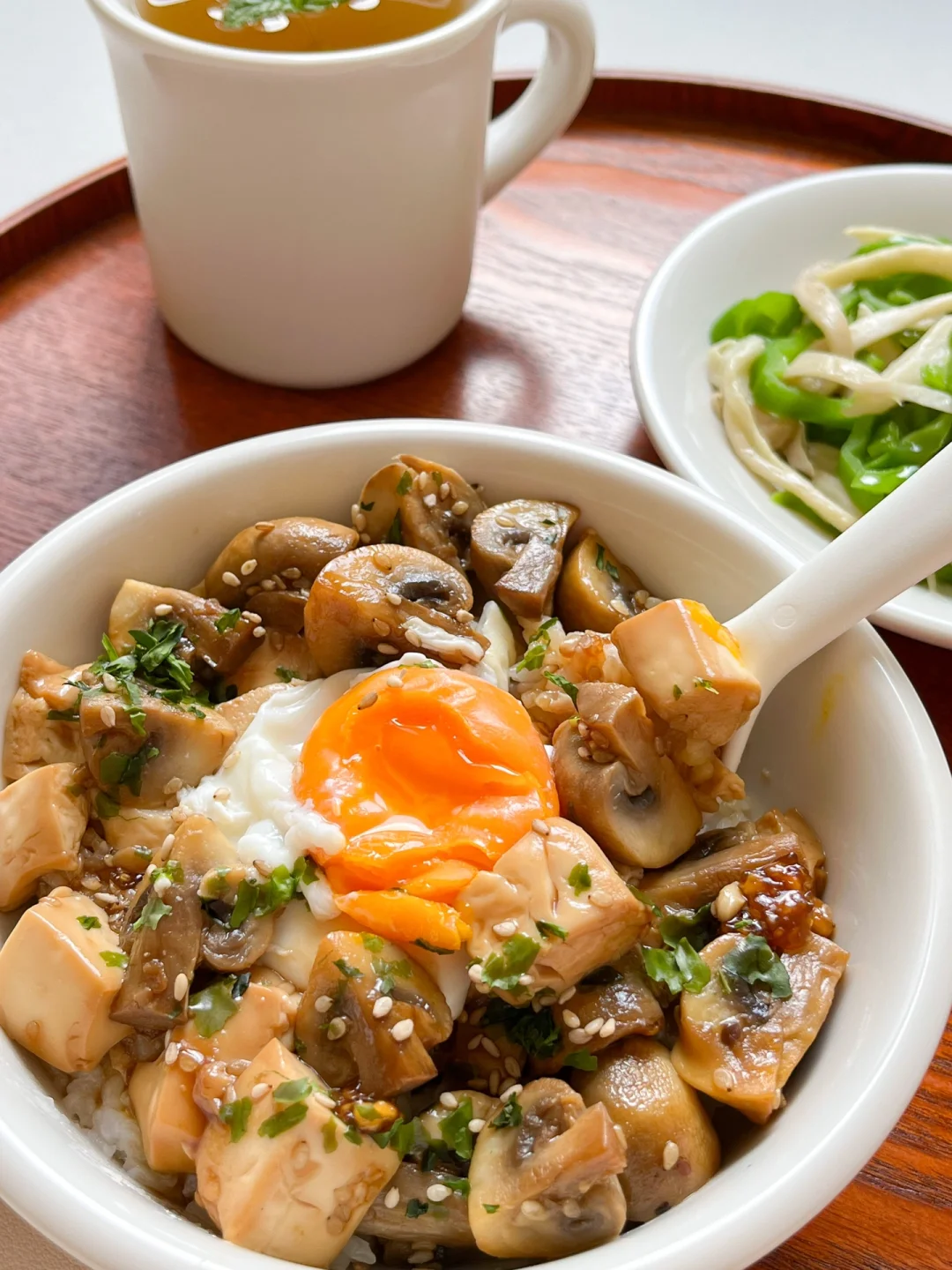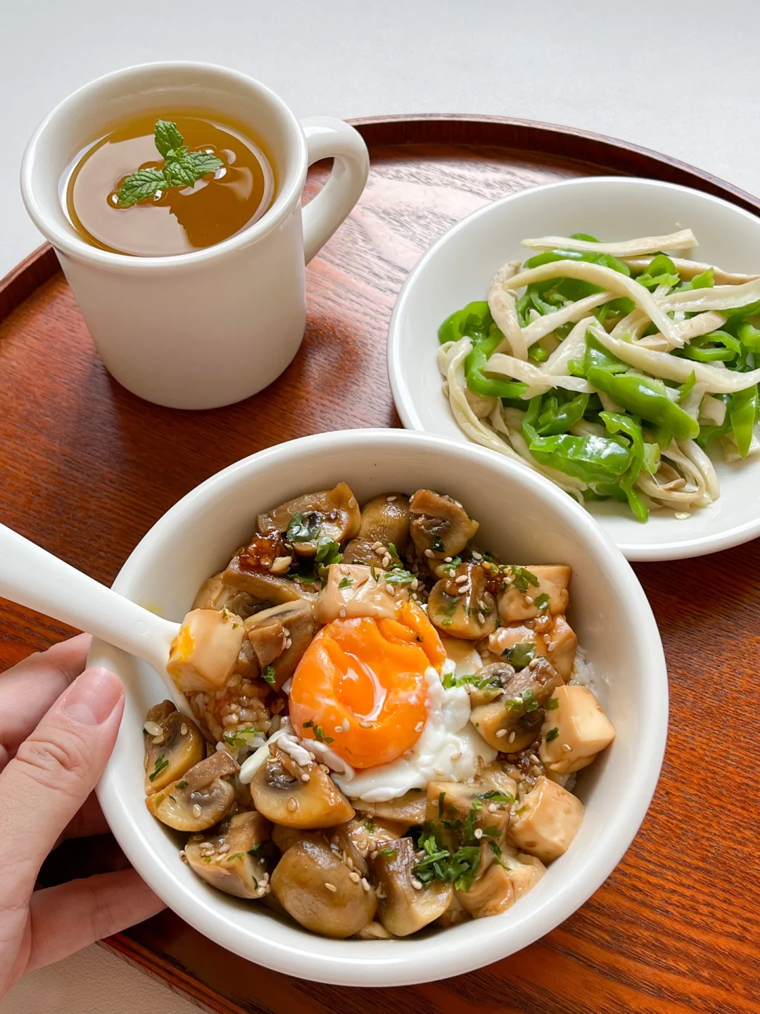 “周末选一天进行素食,清清肠胃。一份饭,一份清淡小炒,吃完身体很舒服。” 今日午餐: ¹口蘑豆腐饭 ²青椒炒杏鲍菇 ³茉莉绿茶 🟤口蘑豆腐饭 很低卡的一份盖饭,简简单单的豆腐和口蘑就能做。口蘑很鲜,切四瓣用黄油炒香,放半盒嫩豆腐,酱油和味淋1:1调一个酱汁,小火煮10分钟就好 🟢青椒炒杏鲍菇 杏鲍菇用手撕成细丝,更容易入味也好熟,跟青椒丝炒得软软的,特别好下饭!调味也是最简单的,只放了盐也很美味