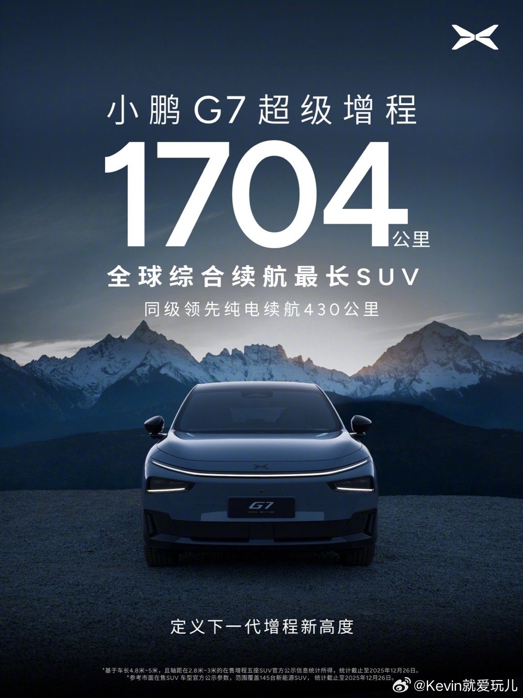1704公里小鹏G7续航长长长长长长长长今天小鹏G7超级增程上市必须要说下G7超级增程真的太卷中型SUV里面 55.8度电池电池支持800V纯电续航430公里这个数据在中型SUV中太顶了而且没有对手之前试驾的时候如果不是刻意用增程模式车子从广州到深圳基本上可以用纯电这个策略太棒了 真的 一会儿价格出来没准中型SUV将迎来大结局了拭目以待吧 朋友们