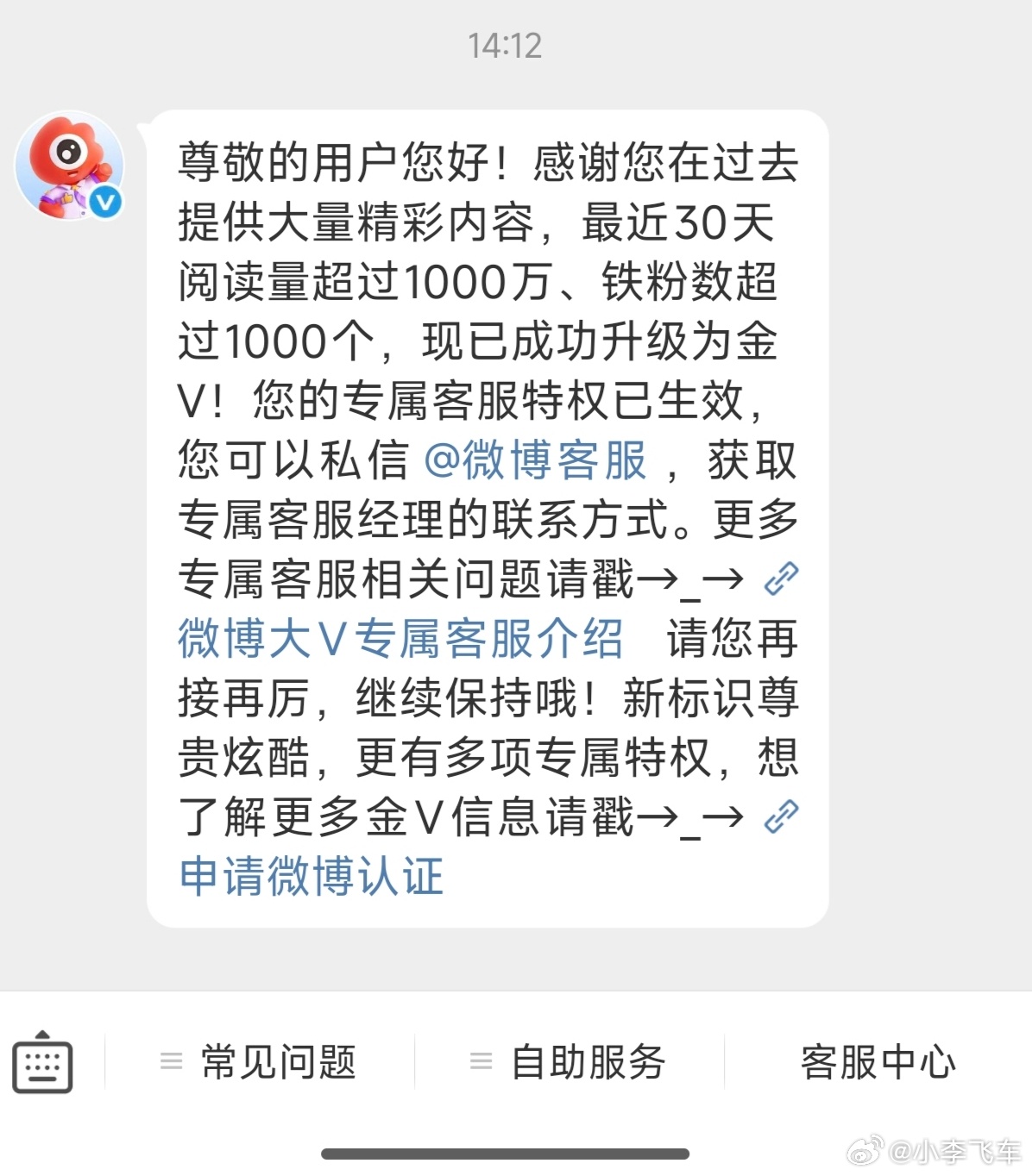 小李飞车 哎呀兄弟们!李副总成金V了呀!微博玩的时间不长,就是发点自己的真实观点而已,全靠各位粉丝朋友厚爱!拜谢啦!等我这几天整理点东西给兄弟姐妹们抽点!我先学一下怎么抽啊,一周内吧!再次感谢有你们真好