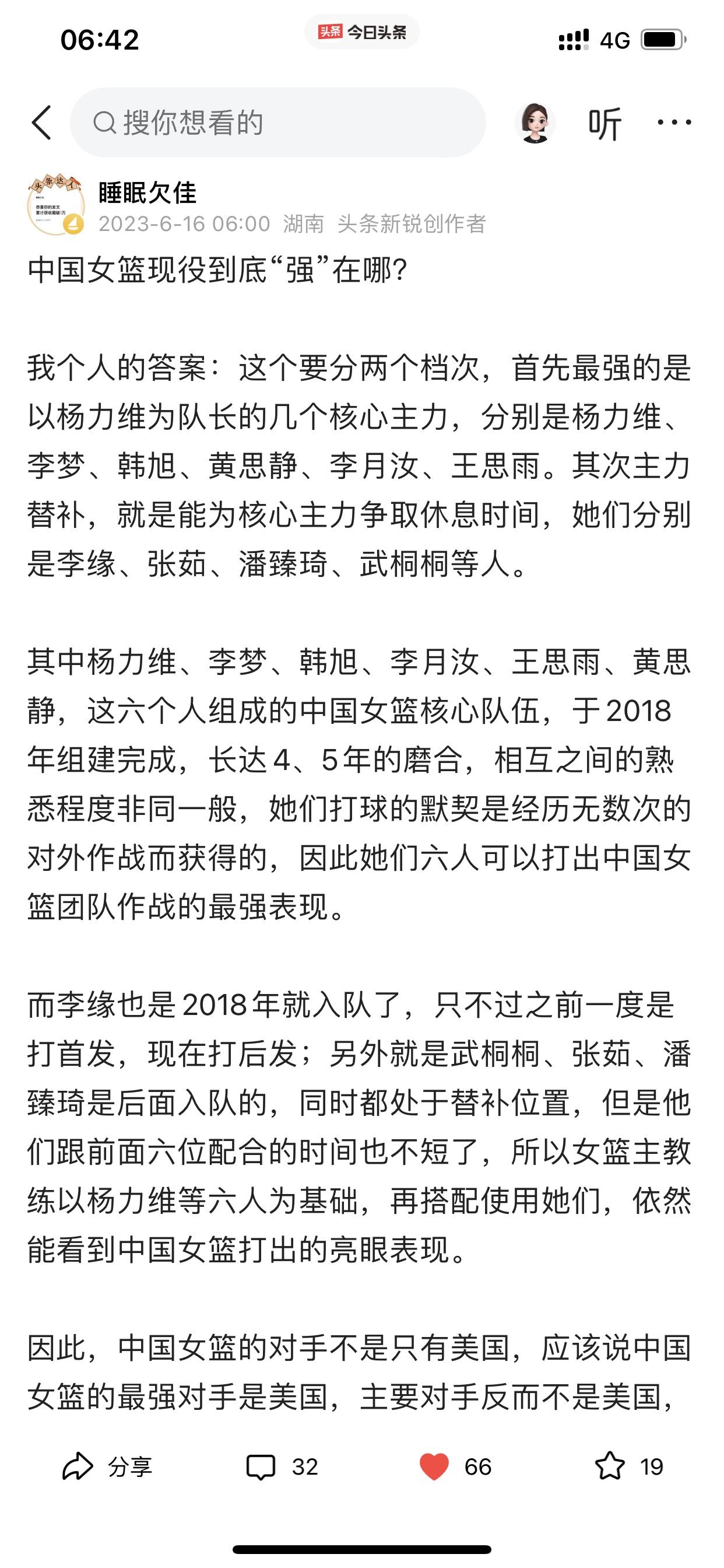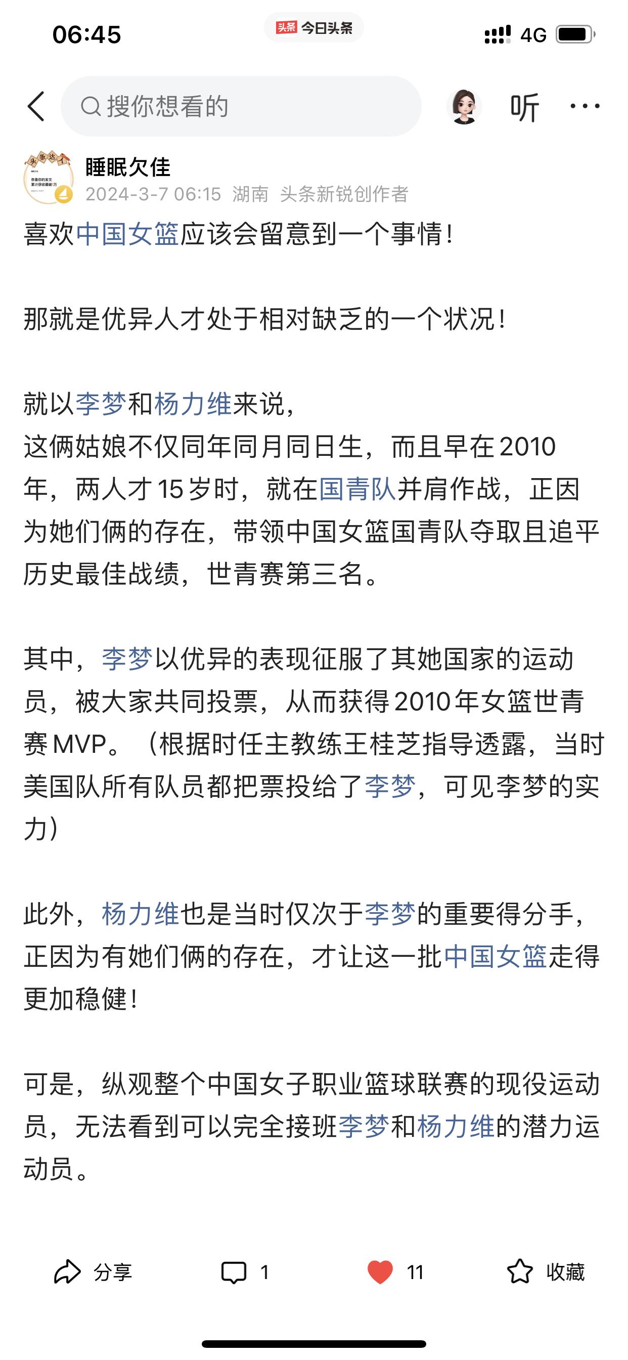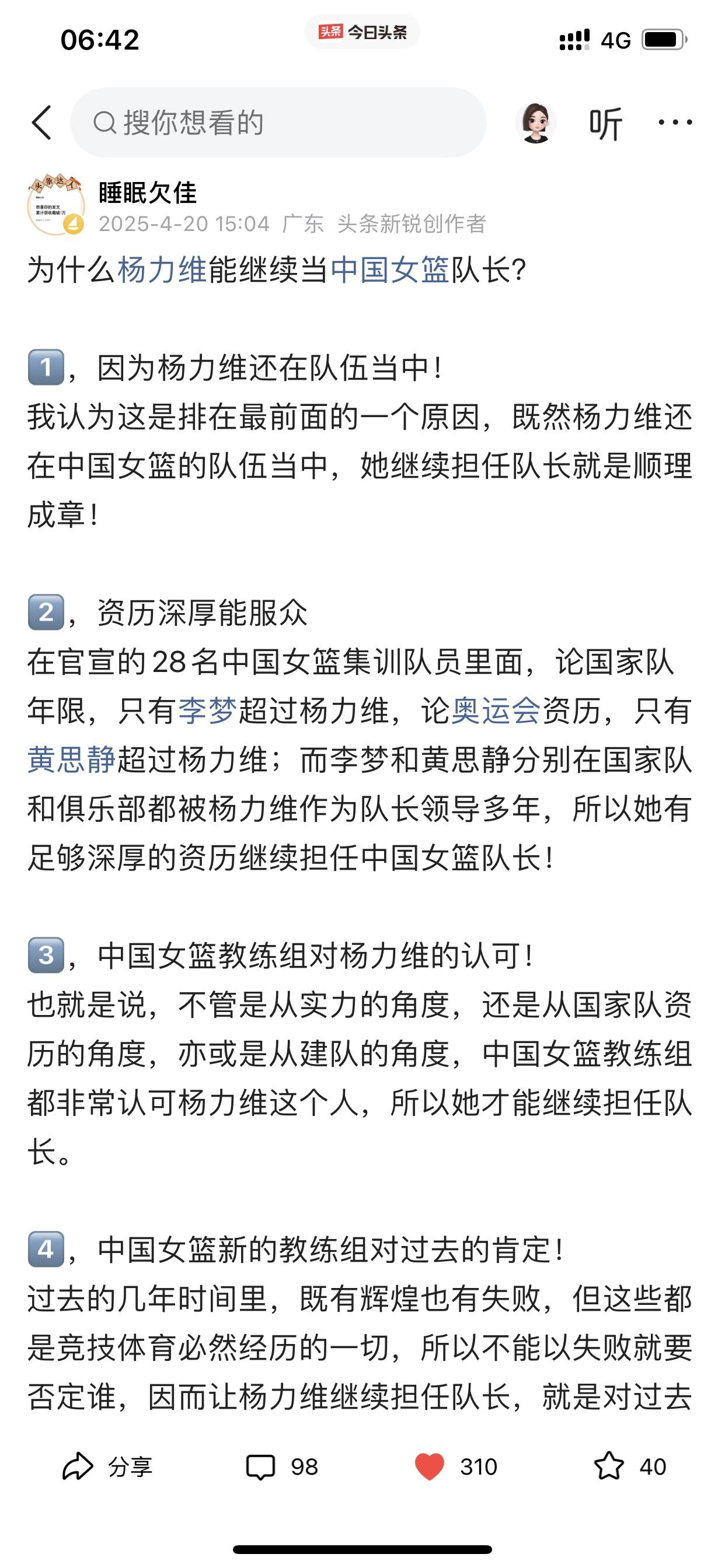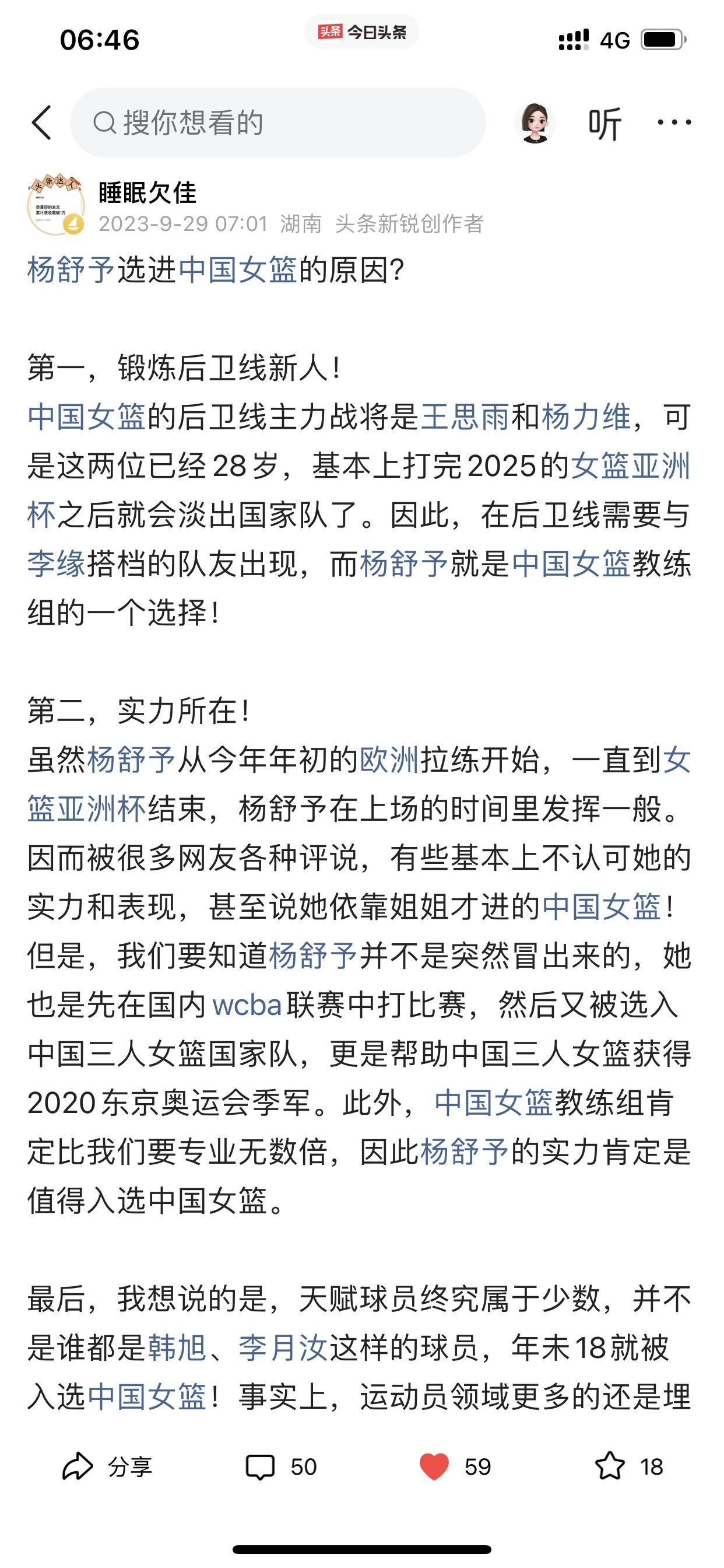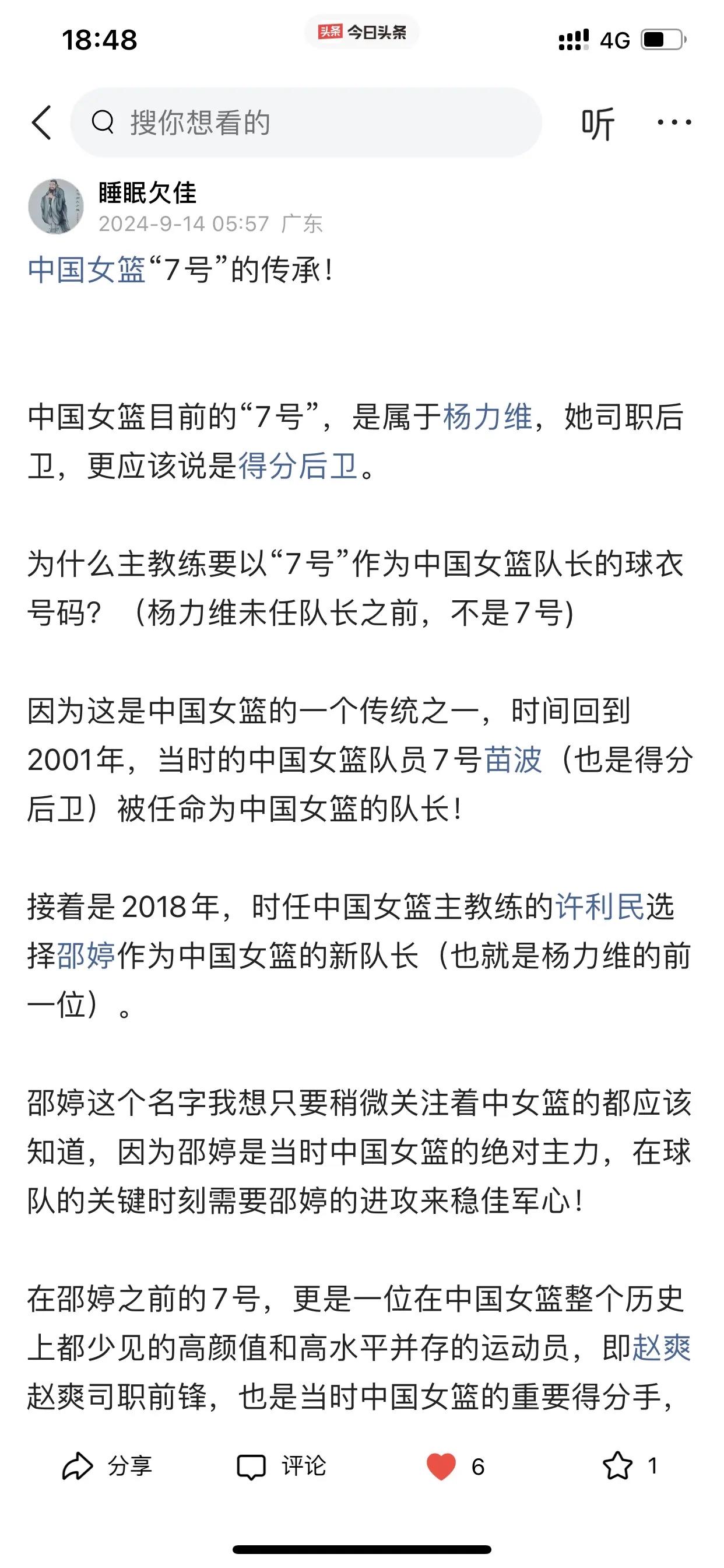 我说说自己对东莞女篮的心理转变! 首先,我忘记自己是因为什么原因而关注孙梦然的球路,然后因为孙梦然而关注八一女篮,从而变成最喜欢看李梦打球,因为李梦才开始关注中国女篮国家队 之后除了喜欢看李梦打球以外,还陆续喜欢看杨力维、黄思静,韩旭、李月汝、王思雨等等,总之对中国女篮国家队每一个成员,我当时都是只有喜欢和欣赏的心理活动。 然而直到去年总决赛期间,黄思静、杨力维、杨舒予她们在比赛期间的诸多令人生厌表情让我很不爽,所以开始讨厌她们! 也许有人会跳出来说我是因为四川女篮输球才有这种心理的? 这个我必须承认,输球是占了一个因素,但不是唯一,如果仅仅是因为输球而要讨厌杨力维等三人,那我早就讨厌她们了! 再说了,我在去年总决赛之前,我曾多次发文试图给杨力维一点微薄支持,也给杨舒予一点微薄支持,哪怕这些微不足道,但表明了我自己的态度!(请看下面截图内容) 此外,四川女篮输给东莞女篮,去年又不是第一次,在内蒙古女篮第二个总冠军就是击败四川女篮所得,当时我看完总决赛只有遗憾,但没有对赢球一方的任何不爽! 哪怕我已经讨厌她们几个,可是我在去年亚洲杯之前还非常客观的分析过杨力维为什么还是国家队队长(请看下面图六) 在去年总决赛之前,我预测中国女篮大名单,一定会带上杨力维和黄思静,但现在我直接忽略她们两个,但杨舒予我没有忽略,依旧会在我选择之内。 以上说这么多,就是讲一下我对东莞女篮心态转变的过程和我所做的一些动作。 当然,我个人是否喜欢东莞女篮并不重要,但我今天仅仅是想通过这个今日头条建立的平台分享一下我自己对东莞女篮的一个心理转变过程而已!