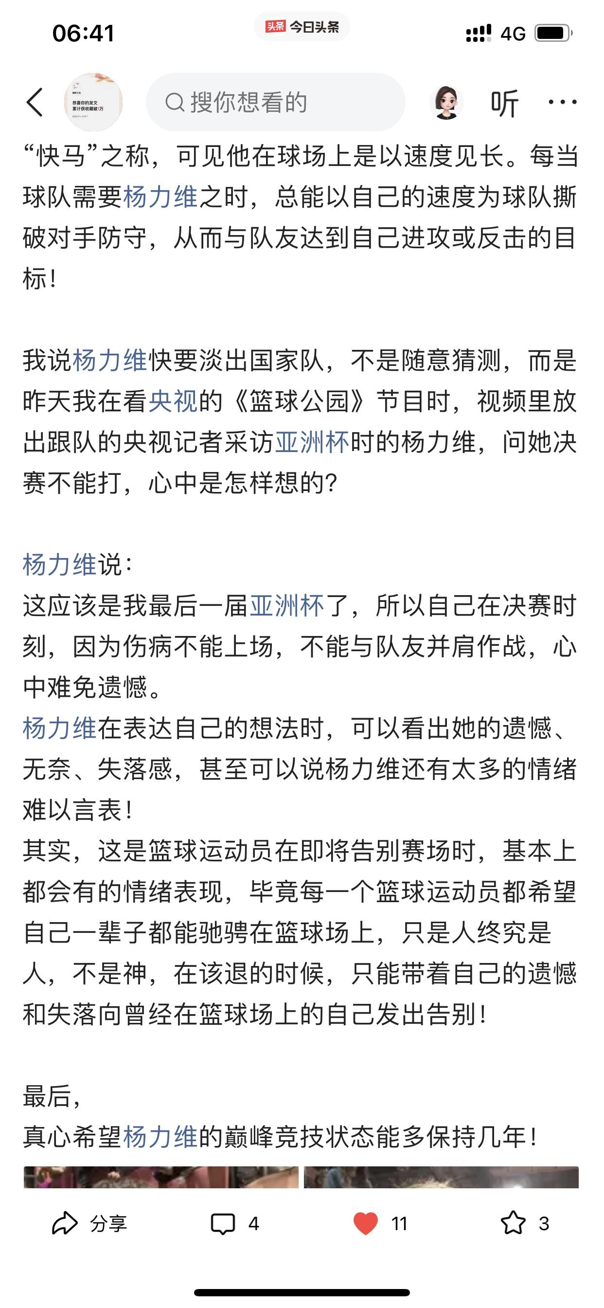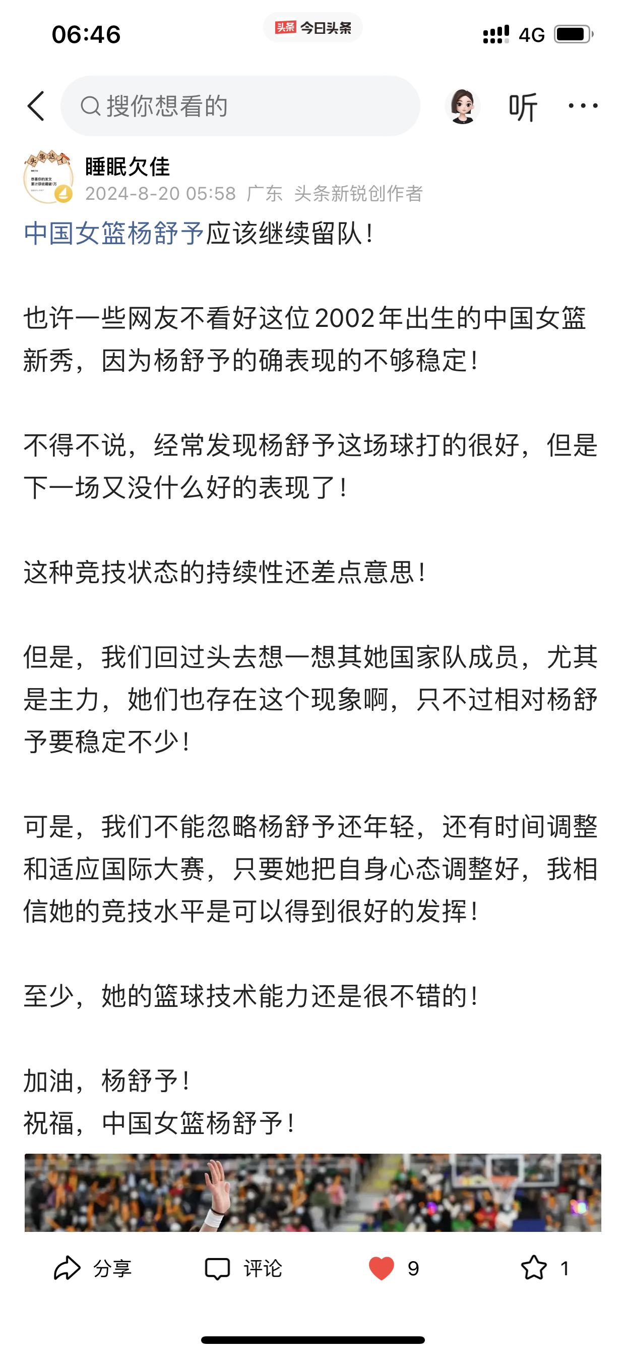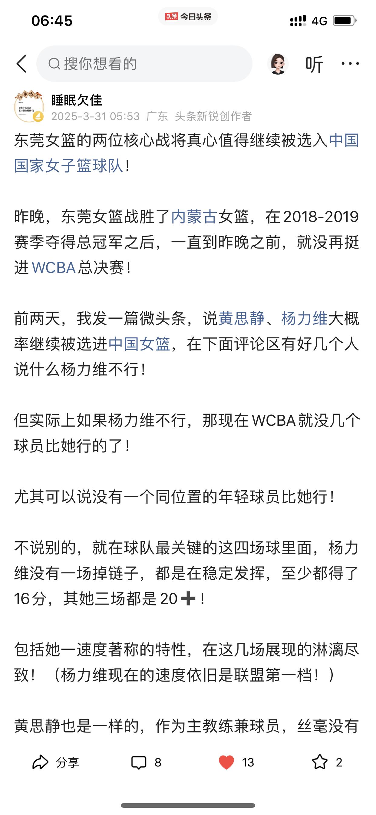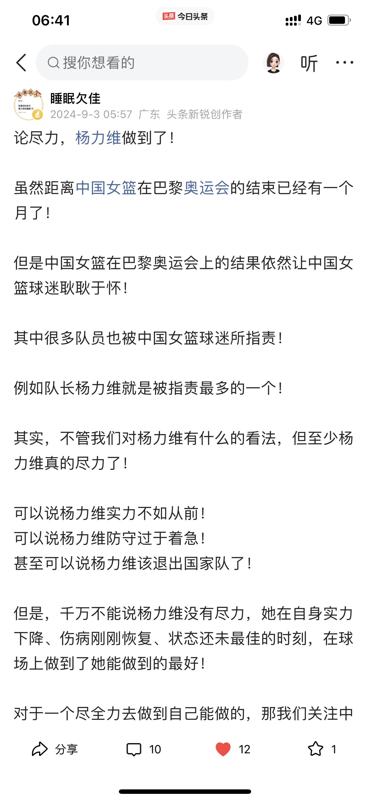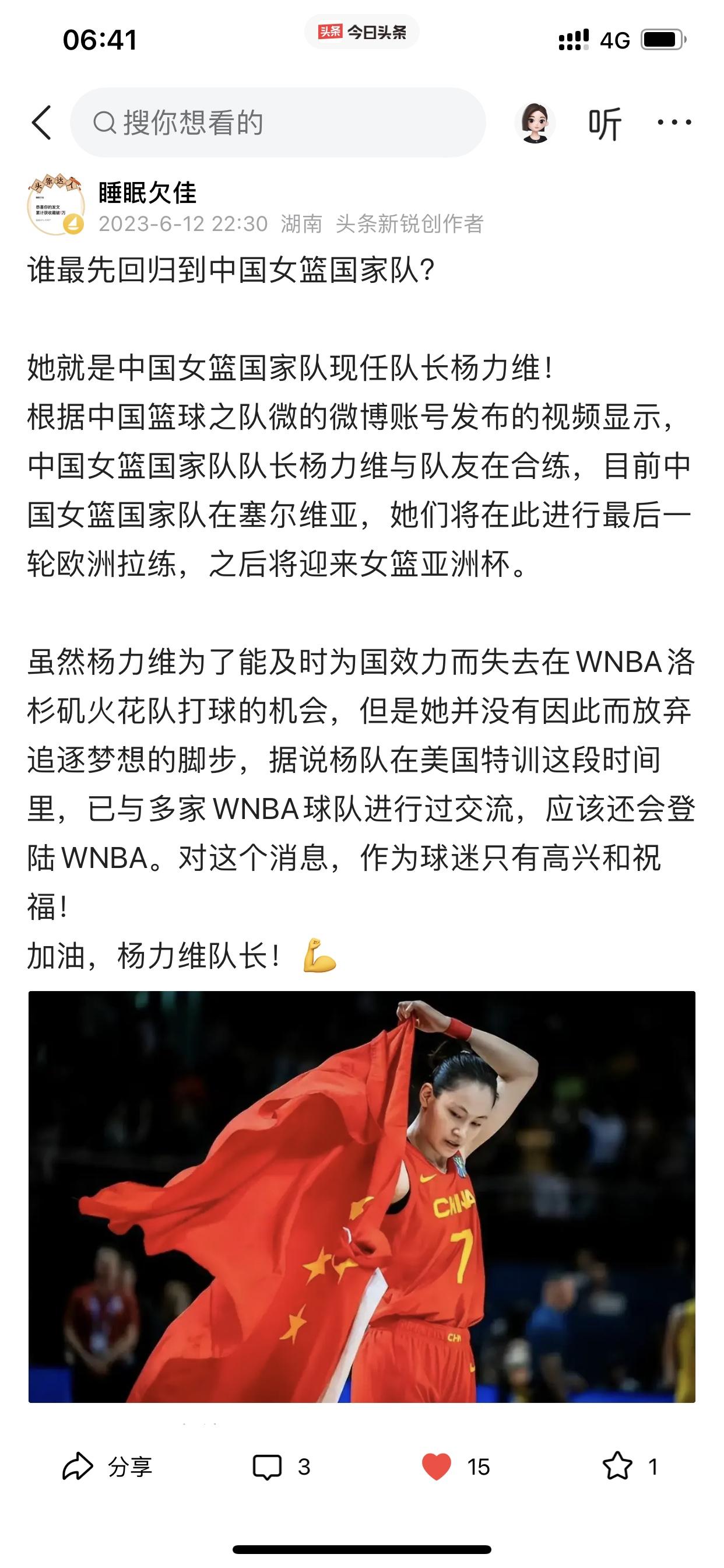 我说说自己对东莞女篮的心理转变! 首先,我忘记自己是因为什么原因而关注孙梦然的球路,然后因为孙梦然而关注八一女篮,从而变成最喜欢看李梦打球,因为李梦才开始关注中国女篮国家队 之后除了喜欢看李梦打球以外,还陆续喜欢看杨力维、黄思静,韩旭、李月汝、王思雨等等,总之对中国女篮国家队每一个成员,我当时都是只有喜欢和欣赏的心理活动。 然而直到去年总决赛期间,黄思静、杨力维、杨舒予她们在比赛期间的诸多令人生厌表情让我很不爽,所以开始讨厌她们! 也许有人会跳出来说我是因为四川女篮输球才有这种心理的? 这个我必须承认,输球是占了一个因素,但不是唯一,如果仅仅是因为输球而要讨厌杨力维等三人,那我早就讨厌她们了! 再说了,我在去年总决赛之前,我曾多次发文试图给杨力维一点微薄支持,也给杨舒予一点微薄支持,哪怕这些微不足道,但表明了我自己的态度!(请看下面截图内容) 此外,四川女篮输给东莞女篮,去年又不是第一次,在内蒙古女篮第二个总冠军就是击败四川女篮所得,当时我看完总决赛只有遗憾,但没有对赢球一方的任何不爽! 哪怕我已经讨厌她们几个,可是我在去年亚洲杯之前还非常客观的分析过杨力维为什么还是国家队队长(请看下面图六) 在去年总决赛之前,我预测中国女篮大名单,一定会带上杨力维和黄思静,但现在我直接忽略她们两个,但杨舒予我没有忽略,依旧会在我选择之内。 以上说这么多,就是讲一下我对东莞女篮心态转变的过程和我所做的一些动作。 当然,我个人是否喜欢东莞女篮并不重要,但我今天仅仅是想通过这个今日头条建立的平台分享一下我自己对东莞女篮的一个心理转变过程而已!