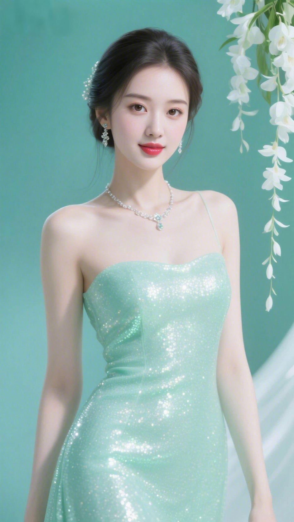 青衿曳影伴花柔 一袭薄荷绿闪片礼裙,似把江南的春水揉进了衣摆,细碎的光粒在裙身轻轻流转,像湖面被风拂过的粼粼波光。颈间的钻链嵌着淡绿晶石,如春水润过的晨露,鬓边的银饰轻摇,与垂落的白花藤蔓相映成景。 指尖轻触裙身的纹路,心底倏然漾开柔软的涟漪。我们总执着于追逐盛大的绚烂,却常常忽略,清浅的温柔才最能抵达心底。这抹青绿色,没有艳色的夺目,却像春日的清风,慢慢吹散心头的纷扰,让美好在静谧里悄然绽放。原来真正动人的美好,从不是刻意的张扬,而是这般于浅淡间藏着的温柔与诗意,在时光里静静流淌。 清新礼服美学 春日温柔意境