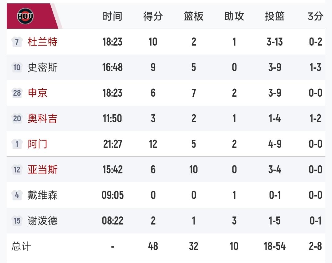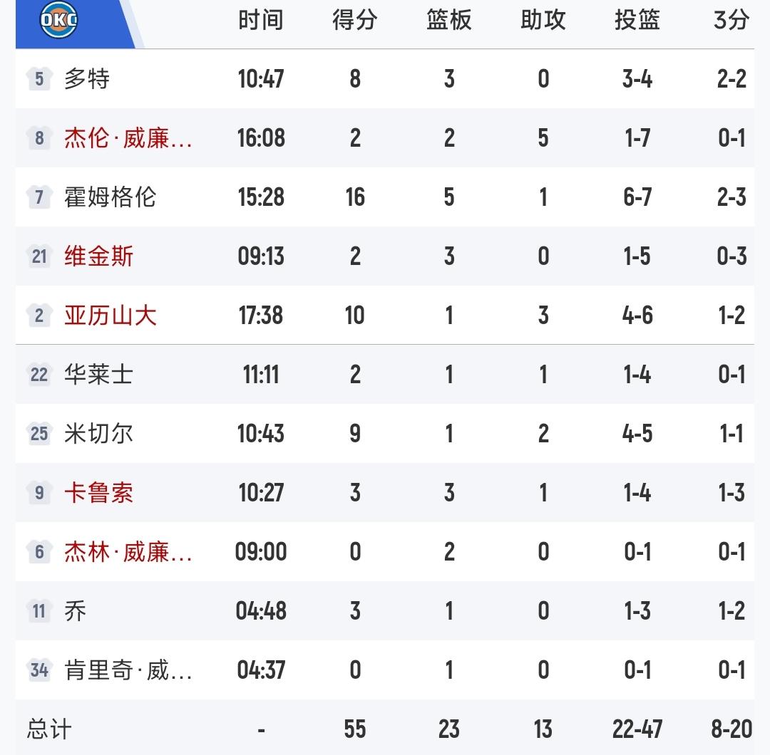 火箭打不过雷霆,半场结束,48-55落后雷霆 第一节虽然限制亚历山大不错,让他没有得分,但是自己也投不进 第二节后半段,亚历山大稍微一发力,瞬间拿到10分,比分一下就拉开了 杜兰特今天手感也不好,只有13投3中拿到10分 下半场不好打了!